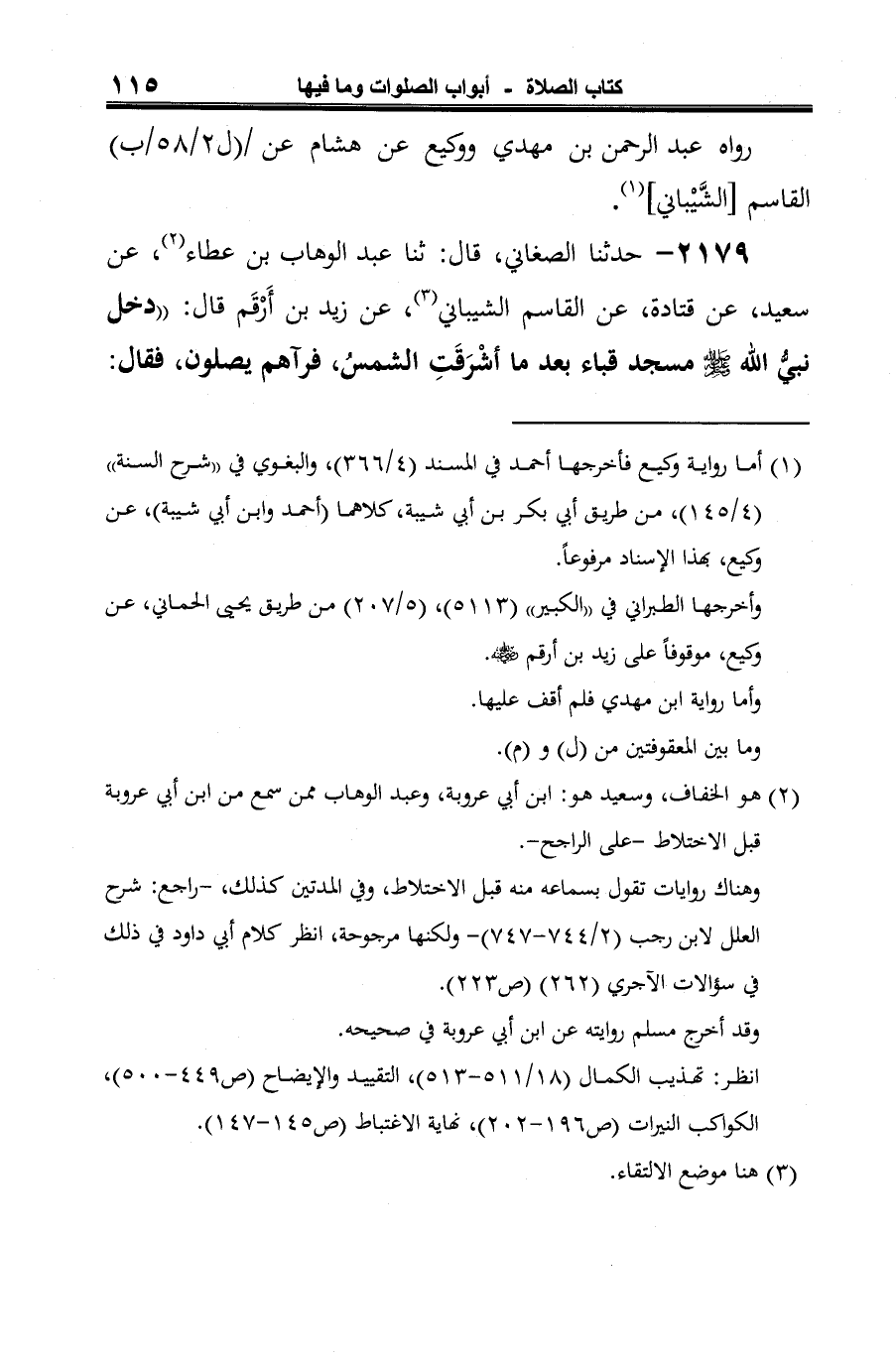 2179 - حدثنا الصغاني، قال: ثنا عبد الوهاب بن عطاء (¬1)، عن سعيد، عن قتادة، عن القاسم الشيباني (¬2)، عن زيد بن أَرْقَم قال: "دخل نبيُّ الله -صلى الله عليه وسلم- مسجد قباء بعد ما أشْرَقَتِ الشمسُ، فرآهم يصلون، فقال:
