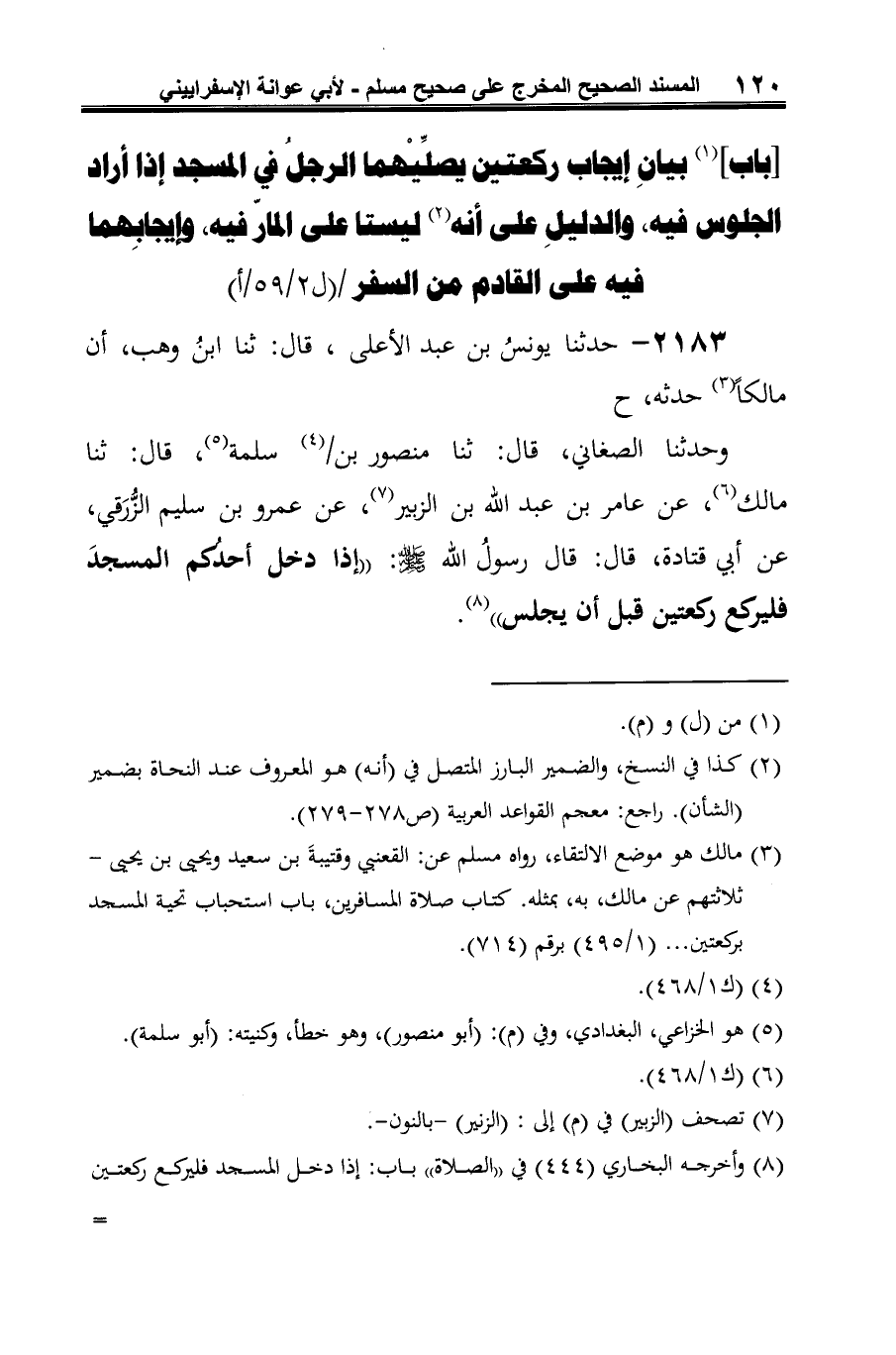 (¬1) مالك هو موضع الالتقاء، رواه مسلم عن: القعنبي وقتيبةَ بن سعيد ويحيى بن يحيى- ثلاثتهم عن مالك، به، بمثله. كتاب صلاة المسافرين، باب استحباب تحية المسجد بركعتين ... (1/ 495) برقم (714).