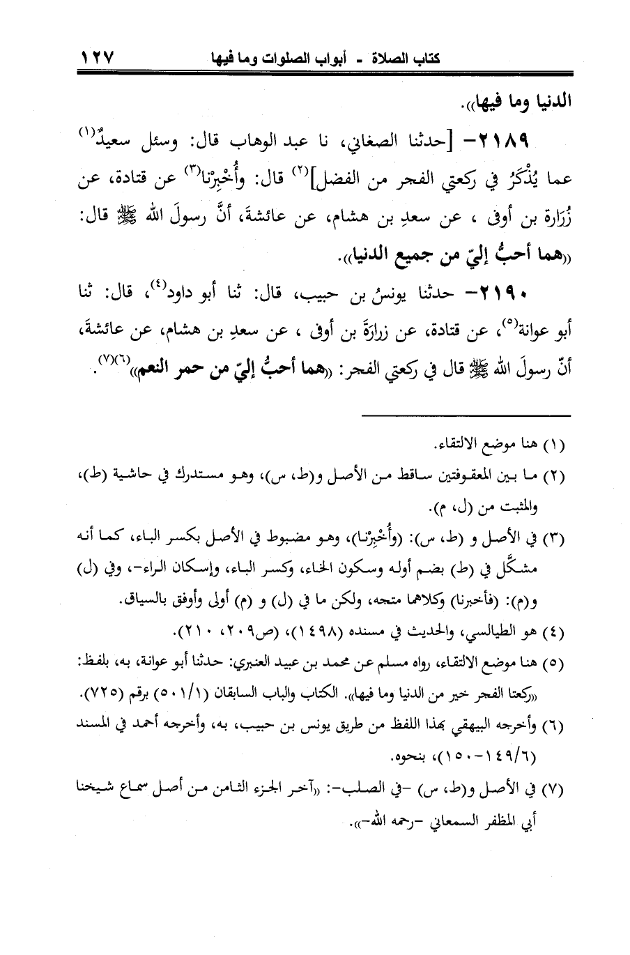 2189 - [حدثنا الصغاني، نا عبد الوهاب قال: وسئل سعيدٌ (¬1) عما يُذْكَرُ في ركعتي الفجر من الفضل] (¬2) قال: وأُخْبِرْنا (¬3) عن قتادة، عن زُرَارة بن أوفى، عن سعدِ بن هشام، عن عائشةَ، أنَّ رسولَ الله -صلى الله عليه وسلم- قال: "هما أحبُّ إليّ من جميع الدنيا".
