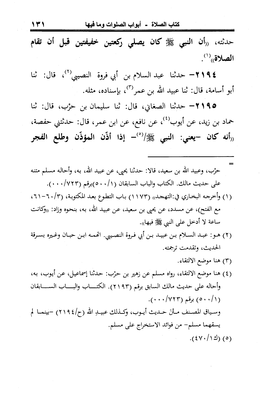 (¬1) هنا موضع الالتقاء، رواه مسلم عن زهير بن حرْب: حدثنا إسماعيل، عن أيوب، به، وأحاله على حديث مالك السابق برقم (2193). الكتاب والباب السابقان (1/ 500) برقم (723 / ...).