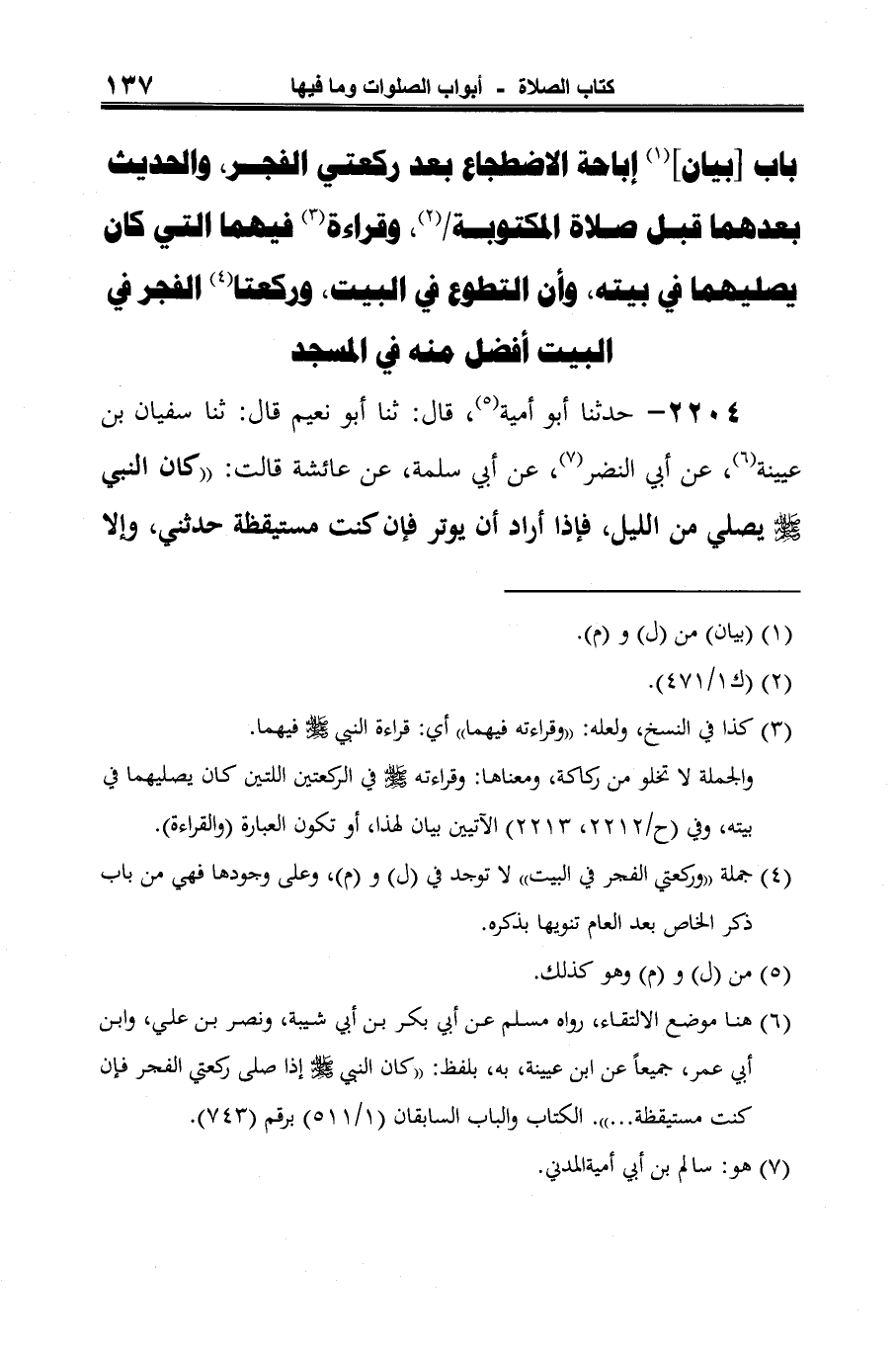 2204 - حدثنا أبو أمية (¬1)، قال: ثنا أبو نعيم قال: ثنا سفيان بن عيينة (¬2)، عن أبي النضر (¬3)، عن أبي سلمة، عن عائشة قالت: "كان النبي -صلى الله عليه وسلم- يصلي من الليل، فإذا أراد أن يوتر فإن كنت مستيقظة حدثني، وإلا