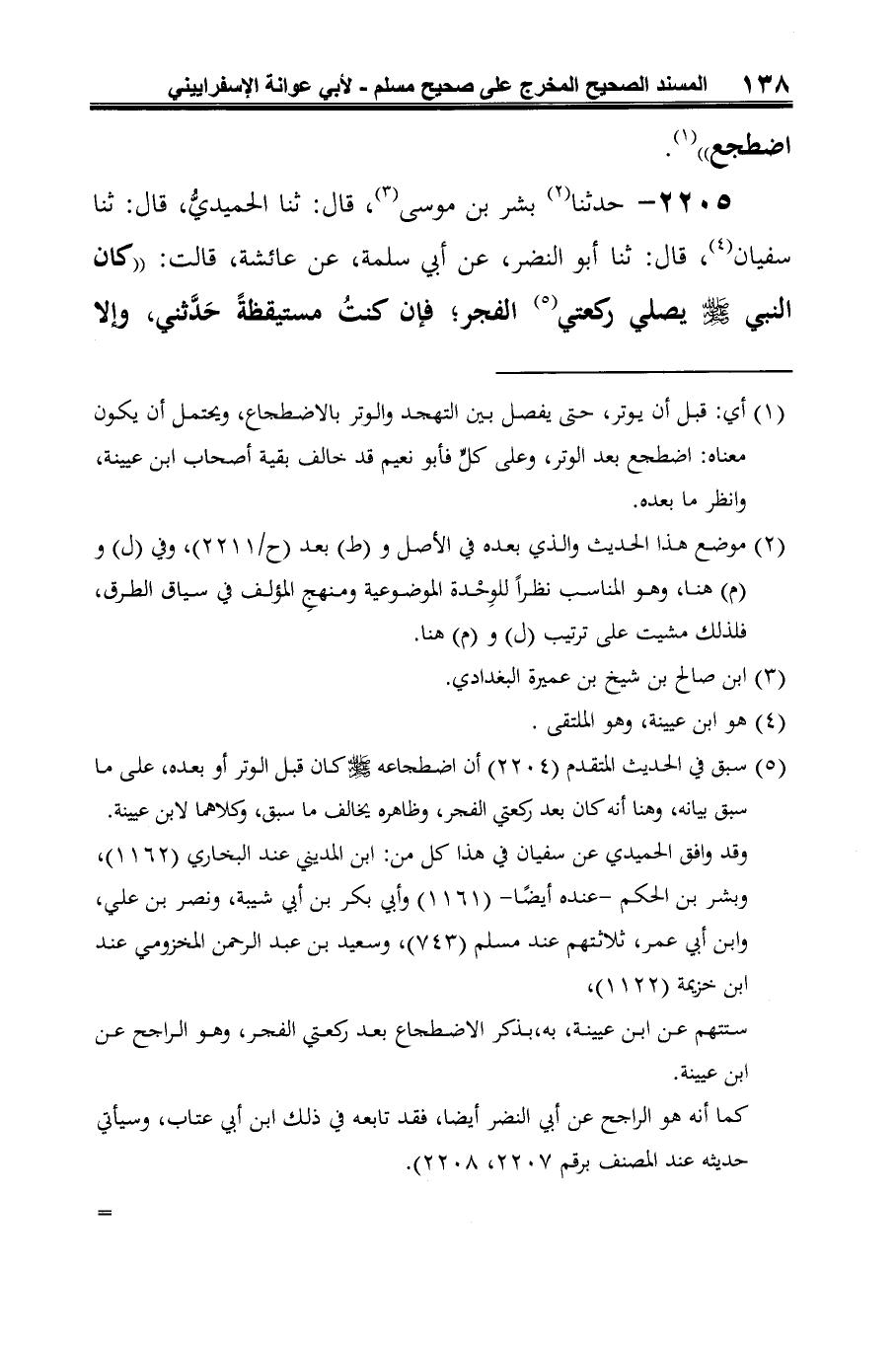2205 - حدثنا (¬1) بشر بن موسى (¬2)، قال: ثنا الحميديُّ، قال: ثنا سفيان (¬3)، قال: ثنا أبو النضر، عن أبي سلمة، عن عائشة، قالت: "كان النبي -صلى الله عليه وسلم- يصلي ركعتي (¬4) الفجر؛ فإن كنتُ مستيقظةً حَدَّثني، وإلا