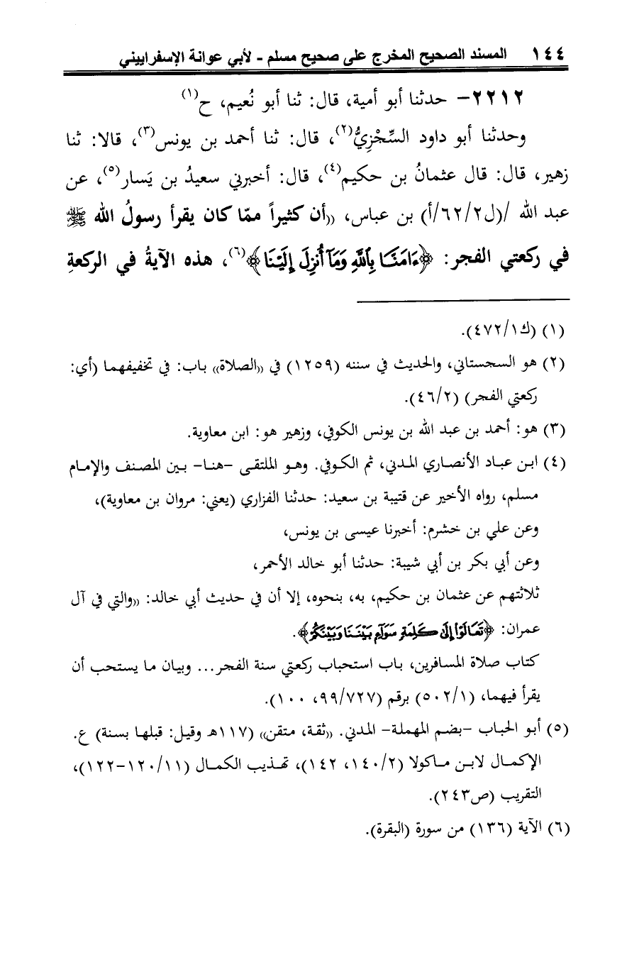 وحدثنا أبو داود السِّجْزِيُّ (¬2)، قال: ثنا أحمد بن يونس (¬3)، قالا: ثنا زهير، قال: قال عثمانُ بن حكيم (¬4)، قال: أخبرني سعيدُ بن يَسار (¬5)، عن عبد الله بن عباس، "أن كثيرًا ممّا كان يقرأ رسولُ الله -صلى الله عليه وسلم- في ركعتي الفجر: {آمَنَّا بِاللَّهِ وَمَا أُنْزِلَ إِلَيْنَا} (¬6)، هذه الآيةُ في الركعةِ