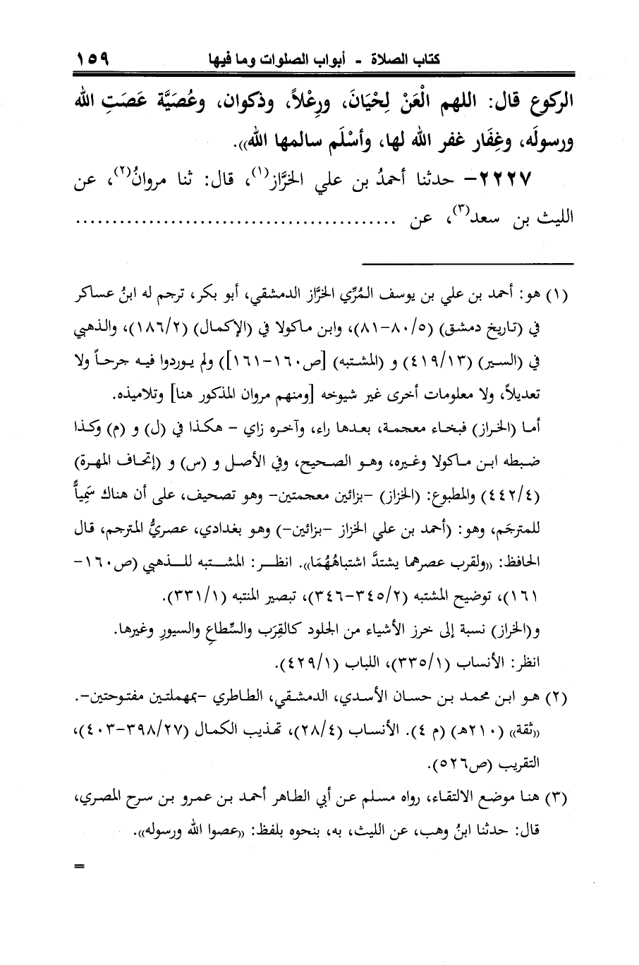 2227 - حدثنا أحمدُ بن علي الخرَّاز (¬1)، قال: ثنا مروانُ (¬2)، عن الليث بن سعد (¬3)، عن