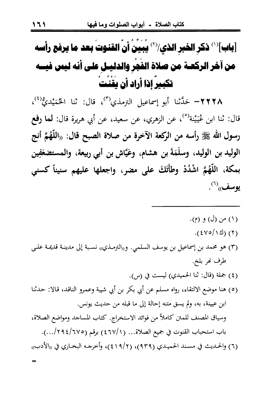 2228 - حَدَّثنا أبو إسماعيل الترمذي (¬1)، قال: ثنا الحُمَيْديُّ (¬2)، قال: ثنا ابن عُيَيْنة (¬3)، عن الزهري، عن سعيد، عن أبي هريرة قال: لما رفع رسول الله -صلى الله عليه وسلم- رأسه من الركعة الآخرة من صلاة الصبح قال: "اللهُمَّ أنج الوليد بن الوليد، وسلَمَةَ بن هشام، وعَيَّاش بن أبي ربيعة، والمستضعَفِين بمكة، اللهُمَّ اشْدُدْ وطأتَكَ على مضر، واجعلها عليهم سنينًا كسني يوسف" (¬4).