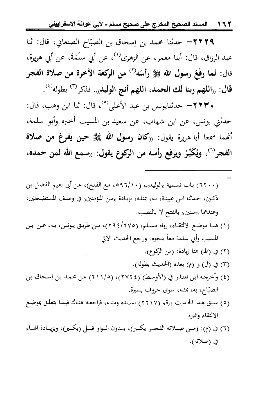 2229 - حدثنا محمد بن إسحاق بن الصبّاح الصنعاني، قال: ثنا عبد الرزاق، قال: أبنا معمر، عن الزهري (¬1)، عن أبي سلَمَةَ، عن أبي هريرة، قال: لما رفَعَ رسول الله -صلى الله عليه وسلم- رأسَه (¬2) من الركعة الآخرة من صلاة الفجر قال: "اللهم ربنا لك الحمد، اللهم أنج الوليد". فذكر (¬3) بطوله (¬4).