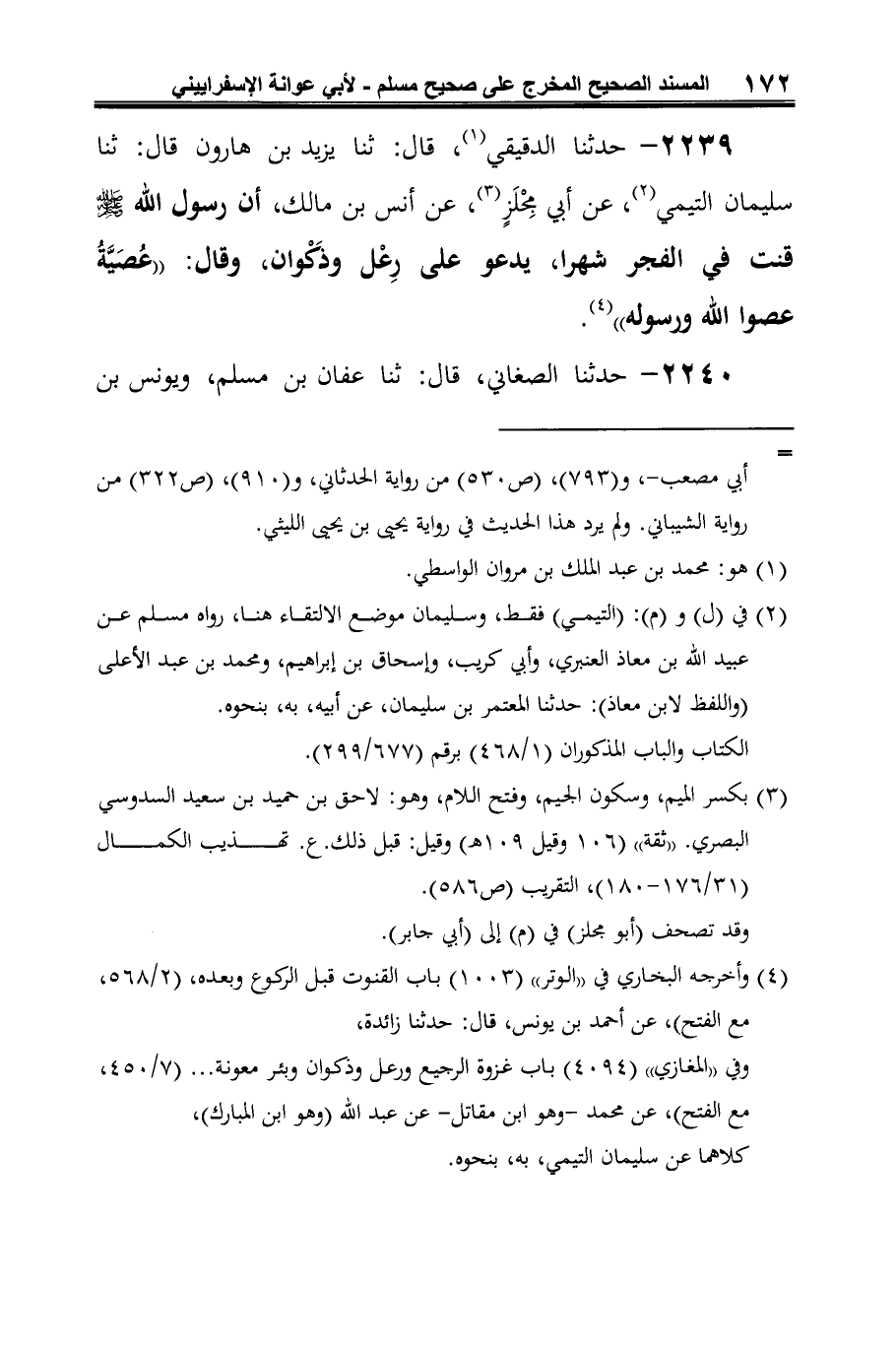 2239 - حدثنا الدقيقي (¬1)، قال: ثنا يزيد بن هارون قال: ثنا سليمان التيمي (¬2)، عن أبي مِجْلَزٍ (¬3)، عن أنس بن مالك، أن رسول الله -صلى الله عليه وسلم- قنت في الفجر شهرًا، يدعو على رِعْل وذكوان، وقال: "عُصَيَّة عصوا الله ورسوله" (¬4).
