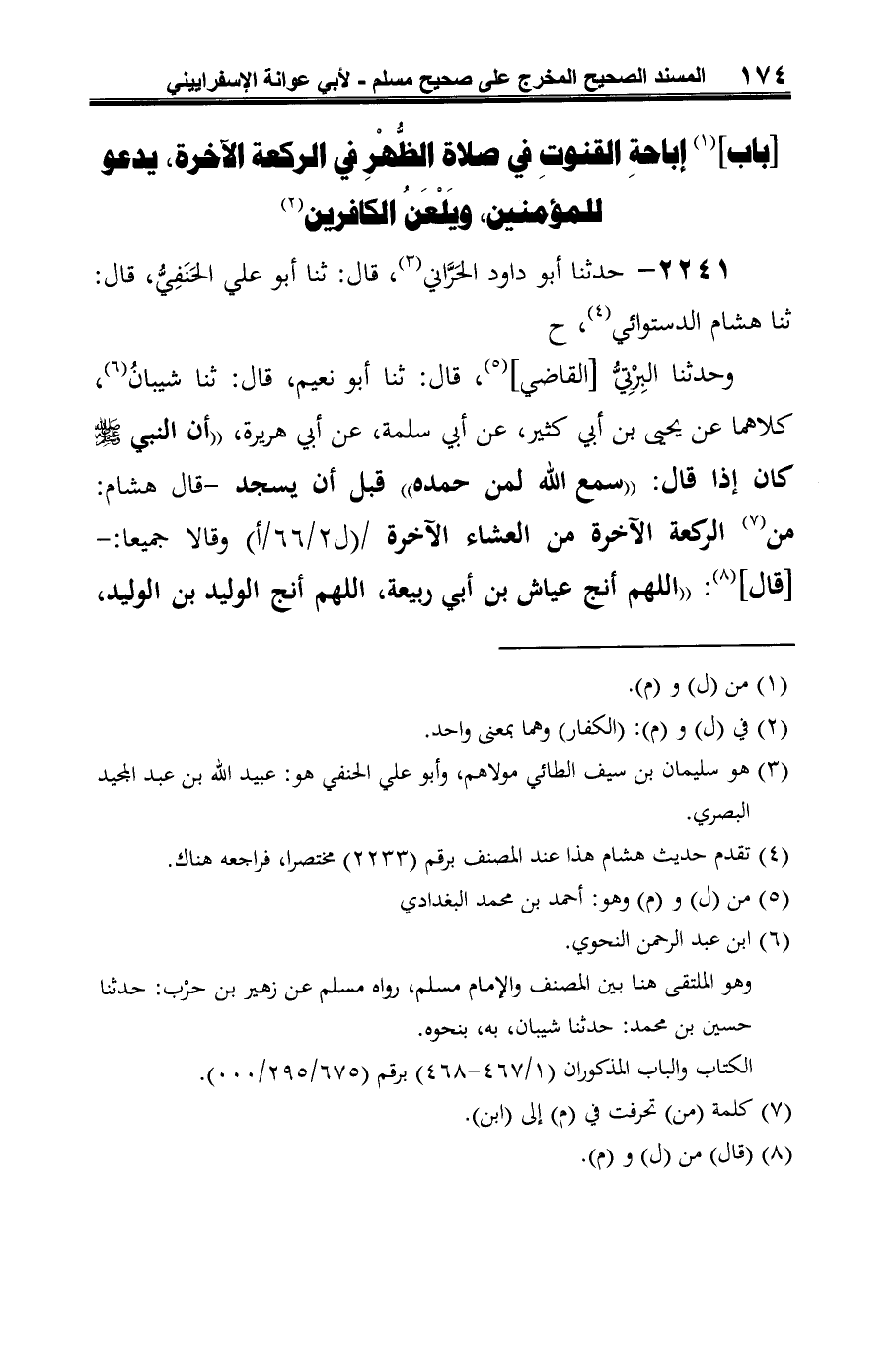 وحدثنا البِرتيُّ [القاضي] (¬3)، قال: ثنا أبو نعيم، قال: ثنا شيبانُ (¬4)، كلاهما عن يحيى بن أبي كثير، عن أبي سلمة، عن أبي هريرة، "أن النبي -صلى الله عليه وسلم- كان إذا قال: "سمع الله لمن حمده" قبل أن يسجد -قال هشام: من (¬5) الركعة الآخرة من العشاء الآخرة وقالا جميعًا: -[قال] (¬6): "اللهم أنج عياش بن أبي ربيعة، اللهم أنج الوليد بن الوليد،