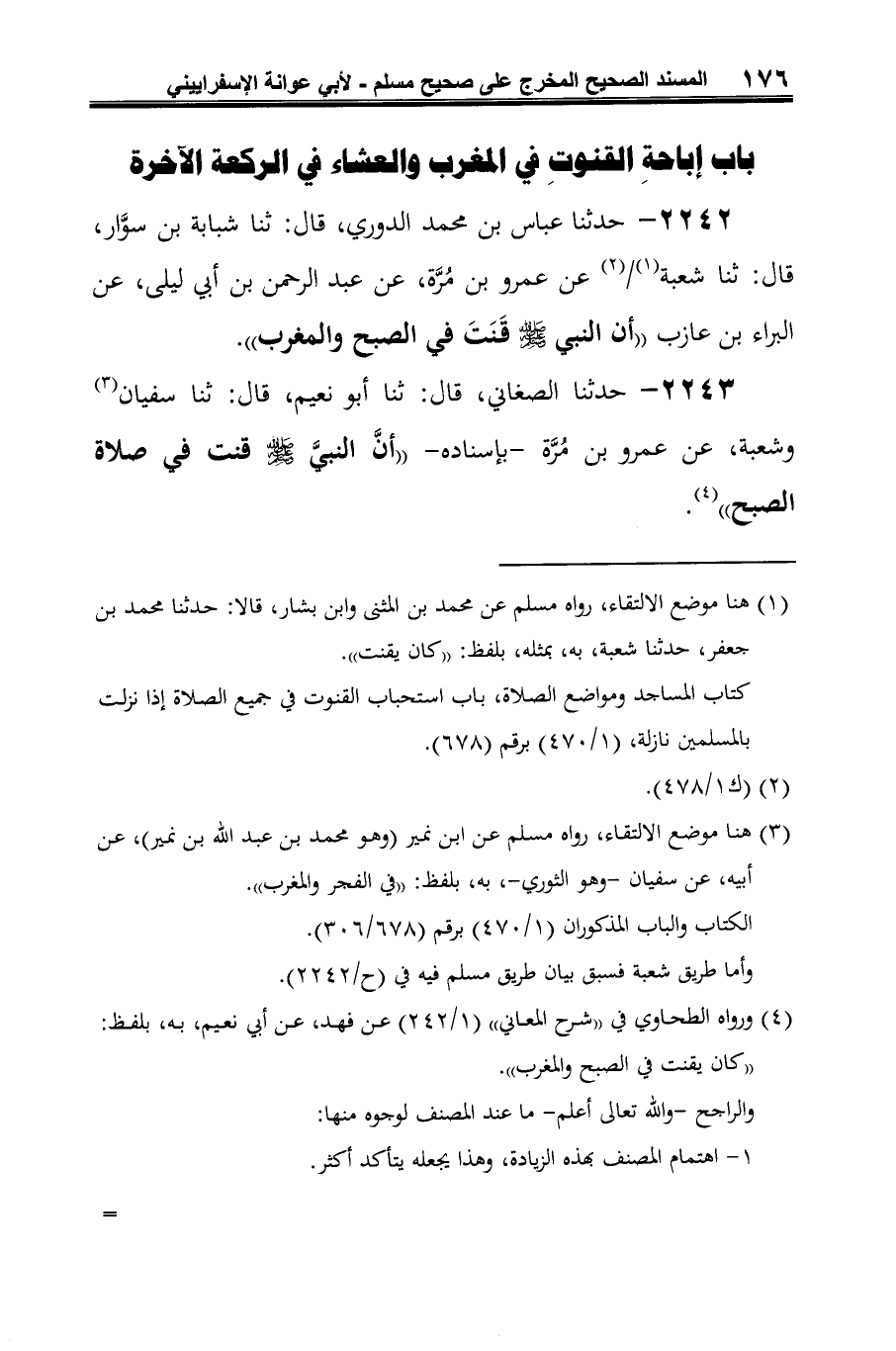 2243 - حدثنا الصغاني، قال: ثنا أبو نعيم، قال: ثنا سفيان (¬1) وشعبة، عن عمرو بن مُرَّة -بإسناده- "أنَّ النبيَّ -صلى الله عليه وسلم- قنت في صلاة الصبح " (¬2).