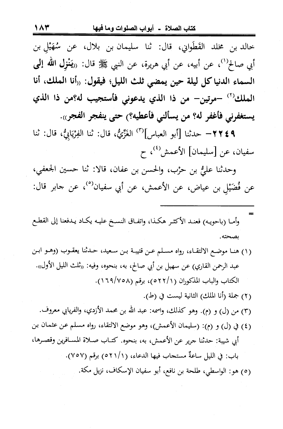 (¬2) في (ل) و (م): (سليمان الأعمش)، وهو موضع الالتقاء، رواه مسلم عن عثمان بن أبي شيبة: حدثنا جرير عن الأعمش، به، بنحوه. كتاب صلاة المسافرين وقصرها، باب: في الليل ساعةٌ مستجاب فيها الدعاء، (1/ 521) برقم (757).