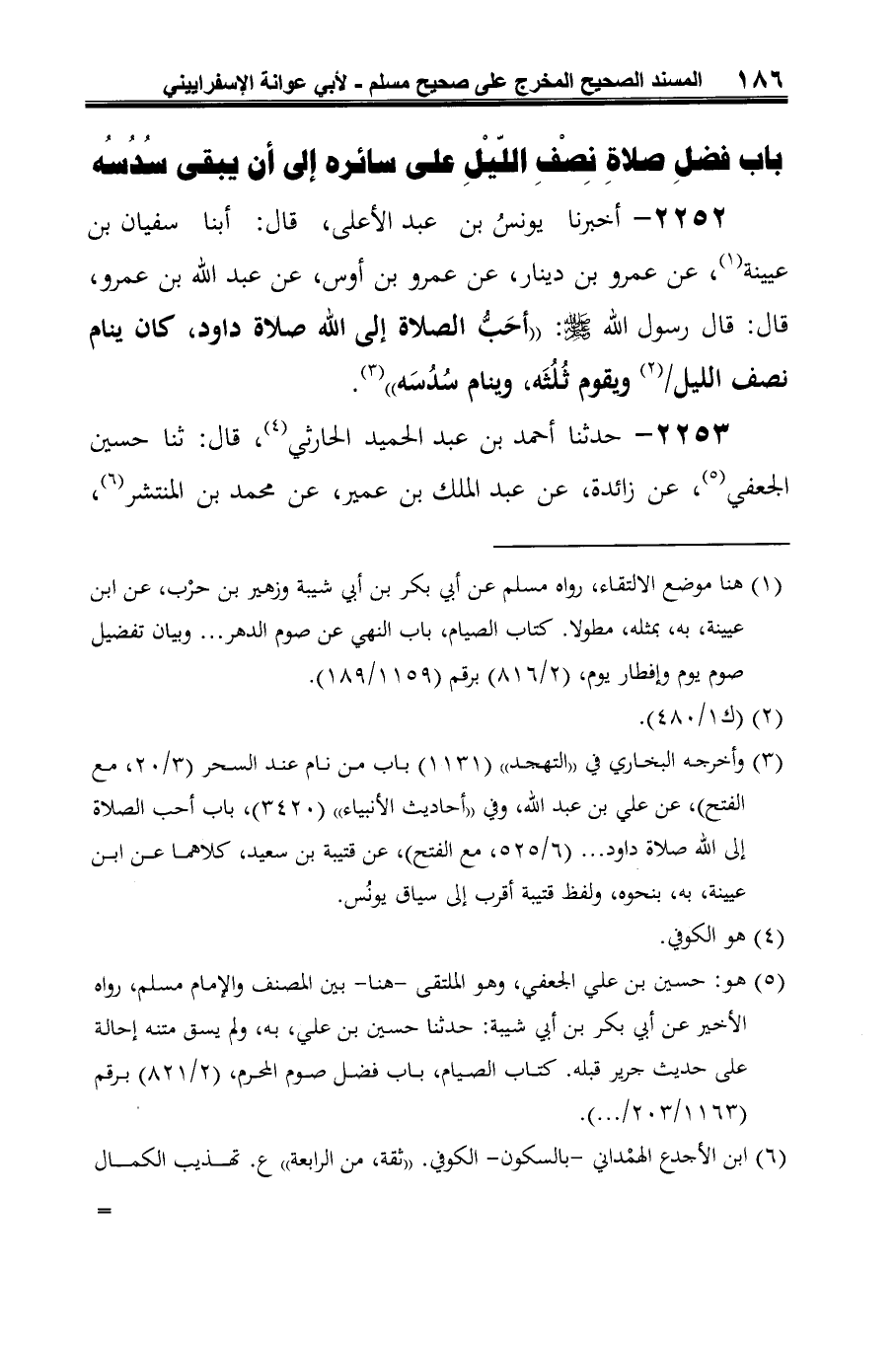 2252 - أخبرنا يونسُ بن عبد الأعلى، قال: أبنا سفيان بن عيينة (¬1)، عن عمرو بن دينار، عن عمرو بن أوس، عن عبد الله بن عمرو، قال: قال رسول الله -صلى الله عليه وسلم-: "أحَبُّ الصلاة إلى الله صلاة داود، كان ينام نصف الليل (¬2) ويقوم ثُلُثَه، وينام سُدُسَه" (¬3).