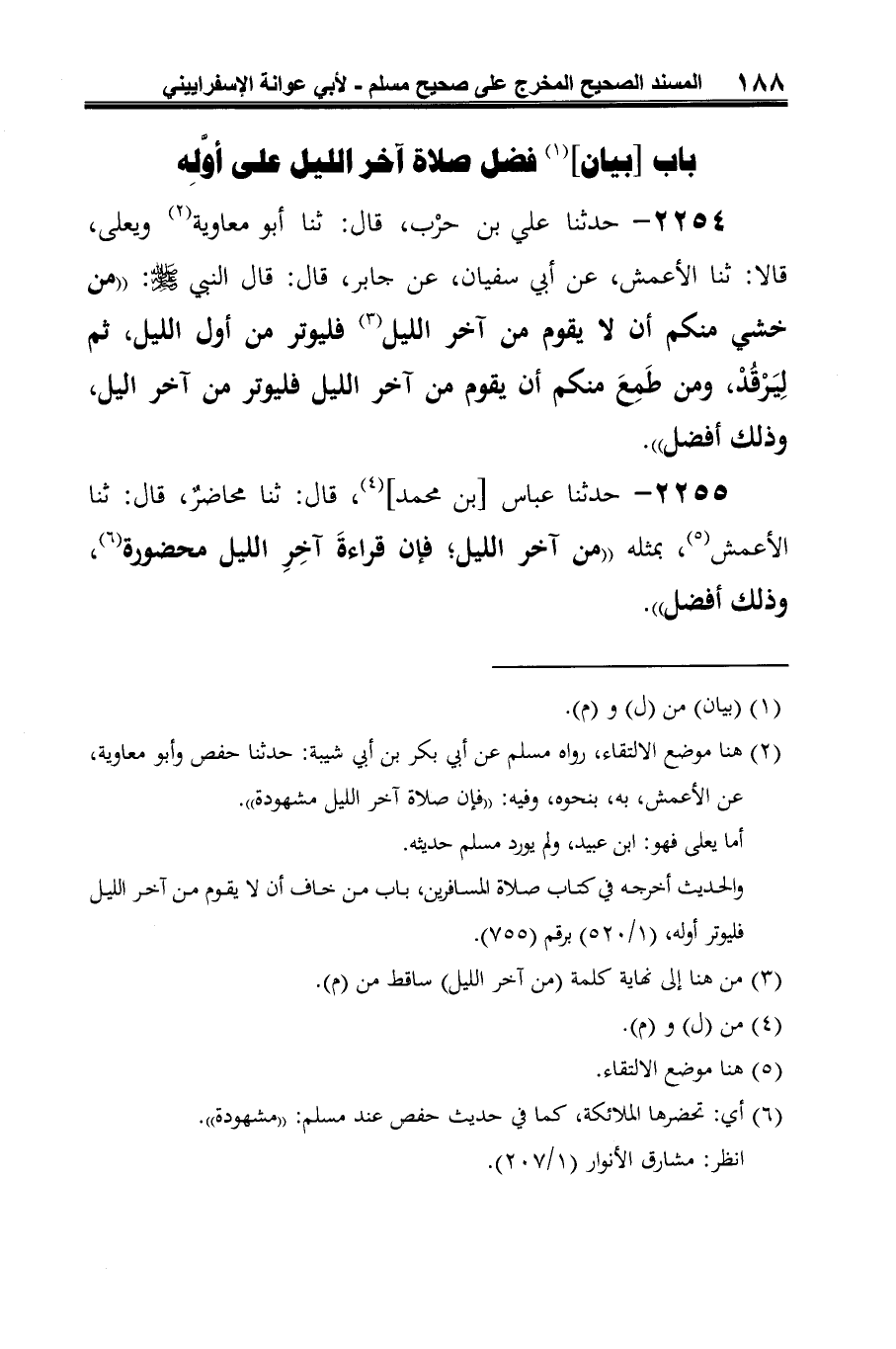 (¬1) هنا موضع الالتقاء، رواه مسلم عن أبي بكر بن أبي شيبة: حدثنا حفص وأبو معاوية، عن الأعمش، به، بنحوه، وفيه: "فإن صلاة آخر الليل مشهودة".