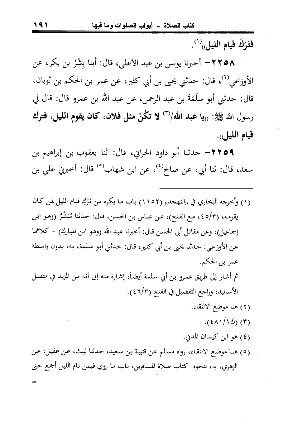 2258 - أخبرنا يونس بن عبد الأعلى، قال: أبنا بِشْرُ بن بكر، عن الأوزاعي (¬1)، قال: حدثني يحيى بن أبي كثير، عن عمر بن الحكم بن ثوبان، قال: حدثني أبو سلَمَةَ بن عبد الرحمن، عن عبد الله بن عمرو قال: قال لي رسول الله -صلى الله عليه وسلم-: "يا عبد الله (¬2) لا تكُنْ مثل فلان، كان يقوم الليل، فترك قيام الليل".