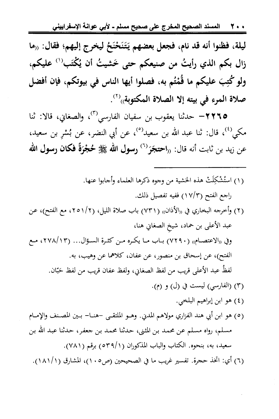 2265 - حدثنا يعقوب بن سفيان الفارسي (¬1)، والصغاني، قالا: ثنا مكي (¬2)، قال: ثنا عبد الله بن سعيد (¬3)، عن أبي النضر، عن بُسْرِ بن سعيد، عن زيد بن ثابت أنه قال: "احتجَرَ (¬4) رسول الله -صلى الله عليه وسلم- حُجْرَةً فكان رسول الله