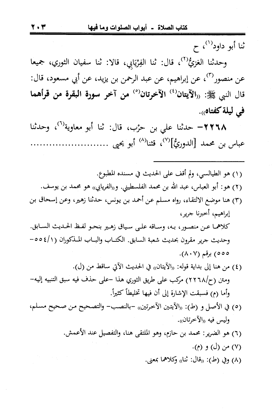 -[204]- الحِمَّاني (¬4)، قالا: ثنا الأعمش (¬5)، عن إبراهيم، عن عبد الرحمن بن يزيد، عن أبي مسعود، قال: قال النبي -صَلَّى الله عَلَيْهِ وَسَلَّمَ-: "الآيتان من آخر سورة البقرة، مَنْ قرأهما في ليلة كفتاه" (¬6).