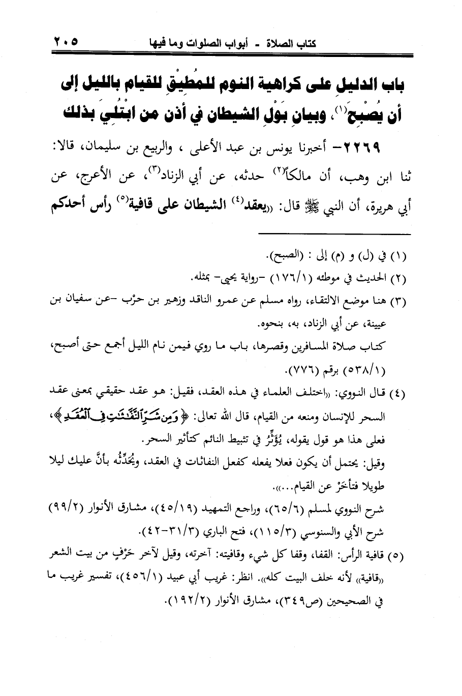 2269 - أخبرنا يونس بن عبد الأعلى، والربيع بن سليمان، قالا: ثنا ابن وهب، أن مالكًا (¬1) حدثه، عن أبي الزناد (¬2)، عن الأعرج، عن أبي هريرة، أن النبي -صلى الله عليه وسلم- قال: "يعقد (¬3) الشيطان على قافية (¬4) رأس أحدكم