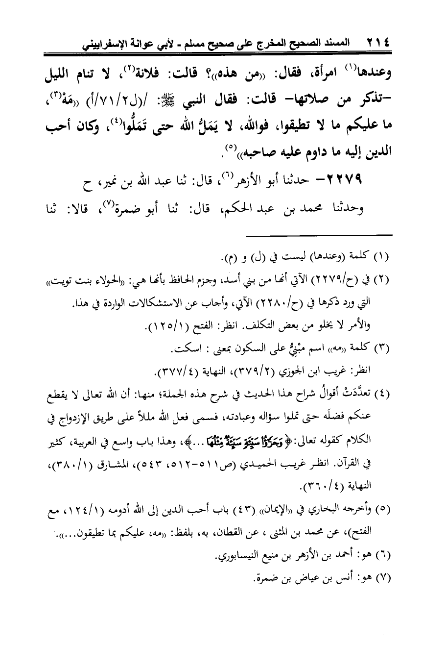 -[215]- هشام بن عروة (¬3)، عن أبيه، عن عائشة، قالت: "كان عندها امرأة من بني أسد (¬4)، فدخل النبي -صلى الله عليه وسلم- عليها، فقال: "من هذه"؟ فقالت: هذه فلانة لا تنام الليل، فقال النبي -صلى الله عليه وسلم-: "عليكم (¬5) بما تطيقون من العمل، فوالله، لا يَمَل الله حتى تَمَلُّوا" قالت: وكان أحب العمل إليه الذي يداوِم عليه صاحبه". زاد ابن نمير: "وإن قلَّ".