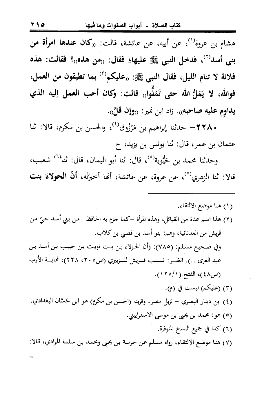 -[216]- تُوَيْت (¬5) مرَّت بها (¬6)، وعندها رسول الله -صلى الله عليه وسلم- قالت: فقلتُ: هذه "الحولاء بنت تُوَيْت" ويزعمون أنها لا تنام الليل، فقال رسول الله -صلى الله عليه وسلم-: "لا تنام الليل؟! خذوا من العمل ما تُطِيْقُونَ، فوالله، لا يَسْأَمُ الله حتى تسأموا (¬7) ".