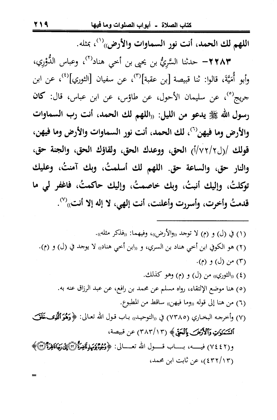 2283 - حدثنا السَّرِيُّ بن يحيى بن أخي هناد (¬1)، وعباس الدُّوْرِي، وأبو أُمَيَّةَ، قالوا: ثنا قبيصة [بن عقبة] (¬2)، عن سفيان [الثوري] (¬3)، عن ابن جريج (¬4)، عن سليمان الأحول، عن طاؤس، عن ابن عباس، قال: كان رسول الله -صلى الله عليه وسلم- يدعو من الليل: "اللهم لك الحمد، أنت رب السماوات والأرض وما فيهن (¬5)، لك الحمد، أنت نور السماوات والأرض وما فيهن، قولك الحق، ووعدك الحق، ولقاؤك الحق، والجنة حق، والنار حق، والساعة حق. اللهم لك أسلمتُ، وبك آمنتُ، وعليك توكلتُ، وإليك أنبتُ، وبك خاصمتُ، وإليك حاكمتُ، فاغفر لي ما قدمتُ وأخرت، وأسررت وأعلنت، أنت إلهي، لا إله إلا أنت" (¬6).