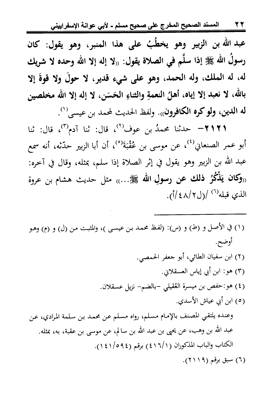 2121 - حدثنا محمدُ بن عوف (¬1)، قال: ثنا آدم (¬2)، قال: ثنا أبو عمر الصنعاني (¬3)، عن موسى بن عُقْبَةَ (¬4)، أن أبا الزبير حدّثه، أنه سمع عبد الله بن الزبير وهو يقول في إثر الصلاة إذا سلم، بمثله، وقال في آخره: "وكان يَذْكُرُ ذلك عن رسولِ الله -صلى الله عليه وسلم-. . ." مثل حديث هشام بن عروة الذي قبله (¬5).