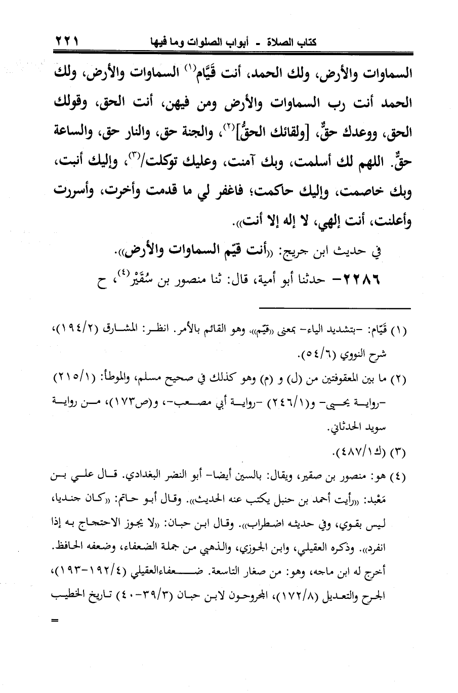 -[223]- عن ابن عباس، قال: كان النبي -صلى الله عليه وسلم- إذا قام كبر، ثم قال: "اللهم لك الحمد، أنت (¬4) قَيَّام السماوات والأرض ومن فيهن، وأنت نور السماوات والأرض وما فيهن، ولك الحمد رب السماوات والأرض ومن فيهن، وأنت حق، ووعدك حق، والجنة حق، والنار حق، والساعة حق. اللهم لك أسلمت، وبك آمنت، وعليك توكلت، وإليك أنبت، وبك خاصمت، وإليك حاكمت، أنت ربنا وإليك المصير. رب (¬5) اغفر لي ما أسررت وما أعلنت، وما قدمت وما أخرت، إلهي لا إله إلا أنت".