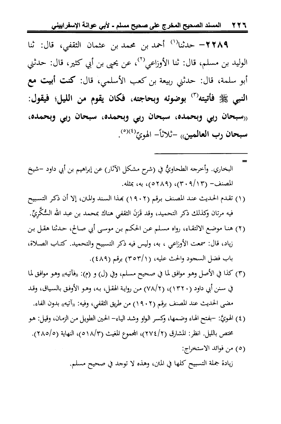 2289 - حدثنا (¬1) أحمد بن محمد بن عثمان الثقفي، قال: ثنا الوليد بن مسلم، قال: ثنا الأوزاعي (¬2)، عن يحيى بن أبي كثير، قال: حدثني أبو سلمة، قال: حدثني ربيعة بن كعب الأسلمي، قال: كنت أبيت مع النبي -صلى الله عليه وسلم- فأتيته (¬3) بوضوئه وبحاجته، فكان يقوم من الليل؛ فيقول: "سبحان ربي وبحمده، سبحان ربي وبحمده، سبحان ربي وبحمده، سبحان رب العالمين" -ثلاثًا- الهويّ (¬4) (¬5).