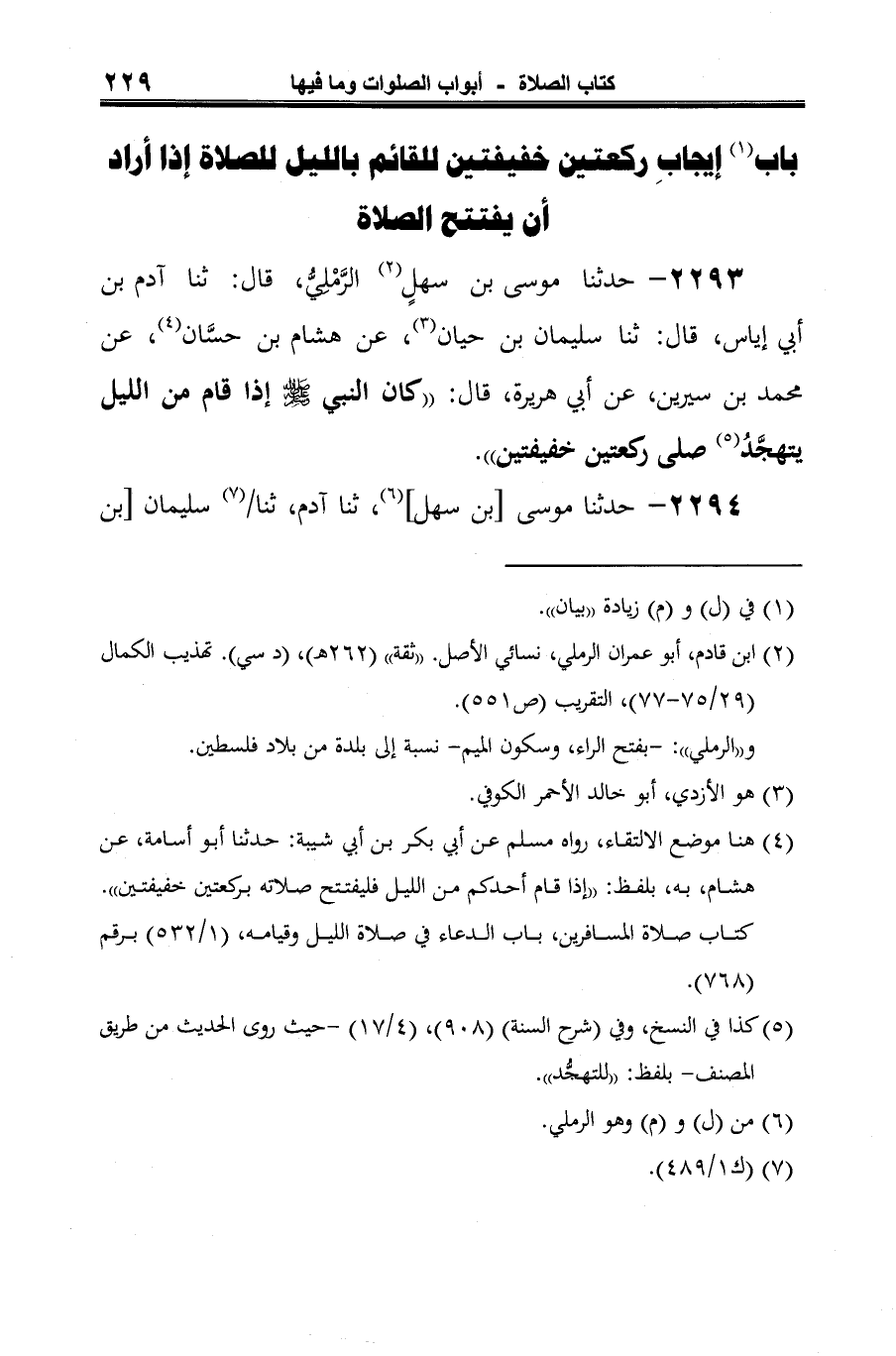 2293 - حدثنا موسى بن سهلٍ (¬1) الرَّمْليُّ، قال: ثنا آدم بن أبي إياس، قال: ثنا سليمان بن حيان (¬2)، عن هشام بن حسَّان (¬3)، عن محمد بن سيرين، عن أبي هريرة، قال: "كان النبي -صلى الله عليه وسلم- إذا قام من الليل يتهجَّدُ (¬4) صلى ركعتين خفيفتين".