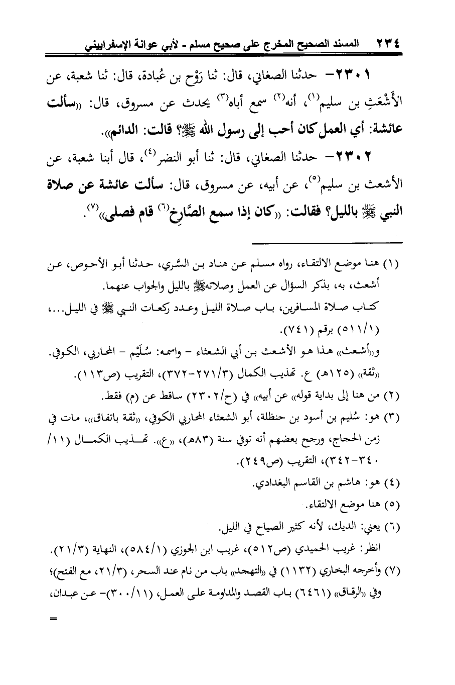 (¬1) هنا موضع الالتقاء، رواه مسلم عن هناد بن السَّري، حدثنا أبو الأحوص، عن أشعث، به، بذكر السؤال عن العمل وصلاته -صلى الله عليه وسلم- الليل والجواب عنهما.