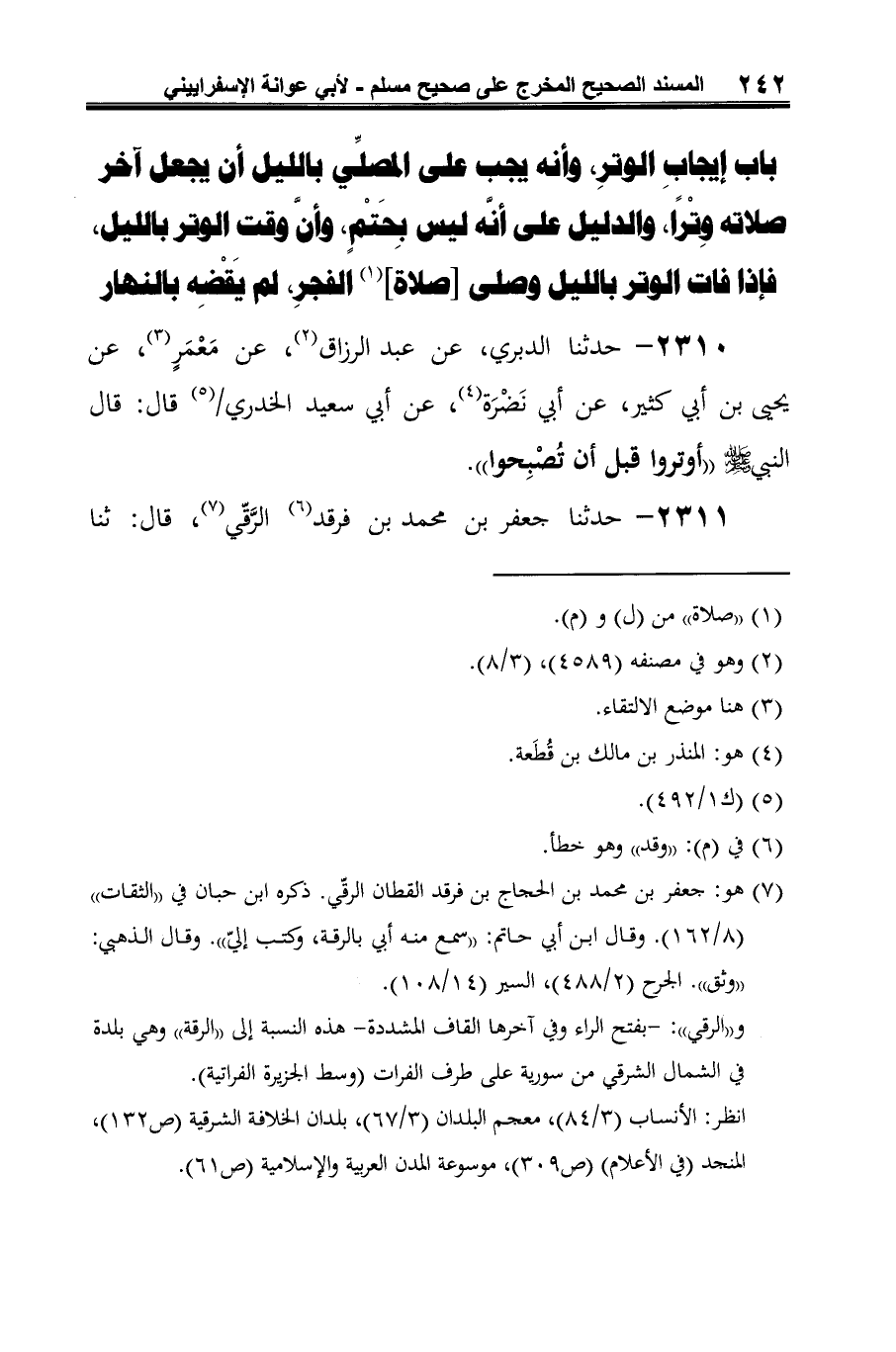 2310 - حدثنا الدبري، عن عبد الرزاق (¬1)، عن مَعْمَرٍ (¬2)، عن يحيى بن أبي كثير، عن أبي نَضْرَة (¬3)، عن أبي سعيد الخدري (¬4) قال: قال النبي -صلى الله عليه وسلم- "أوتروا قبل أن تُصْبِحوا".