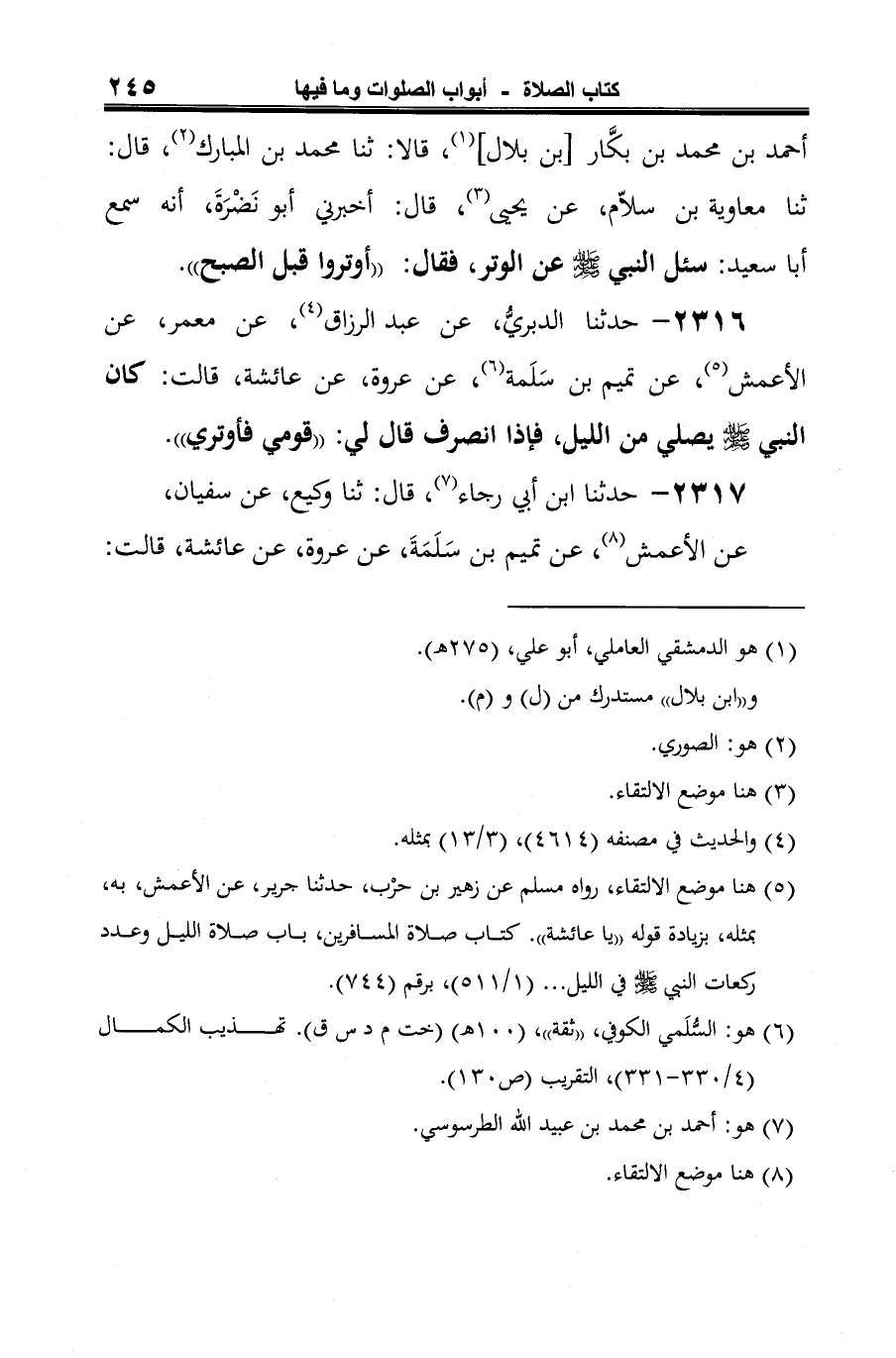 2316 - حدثنا الدبريُّ، عن عبد الرزاق (¬1)، عن معمر، عن الأعمش (¬2)، عن تميم بن سَلَمة (¬3)، عن عروة، عن عائشة، قالت: كان النبي -صلى الله عليه وسلم- يصلي من الليل، فإذا انصرف قال لي: "قومي فأوتري".