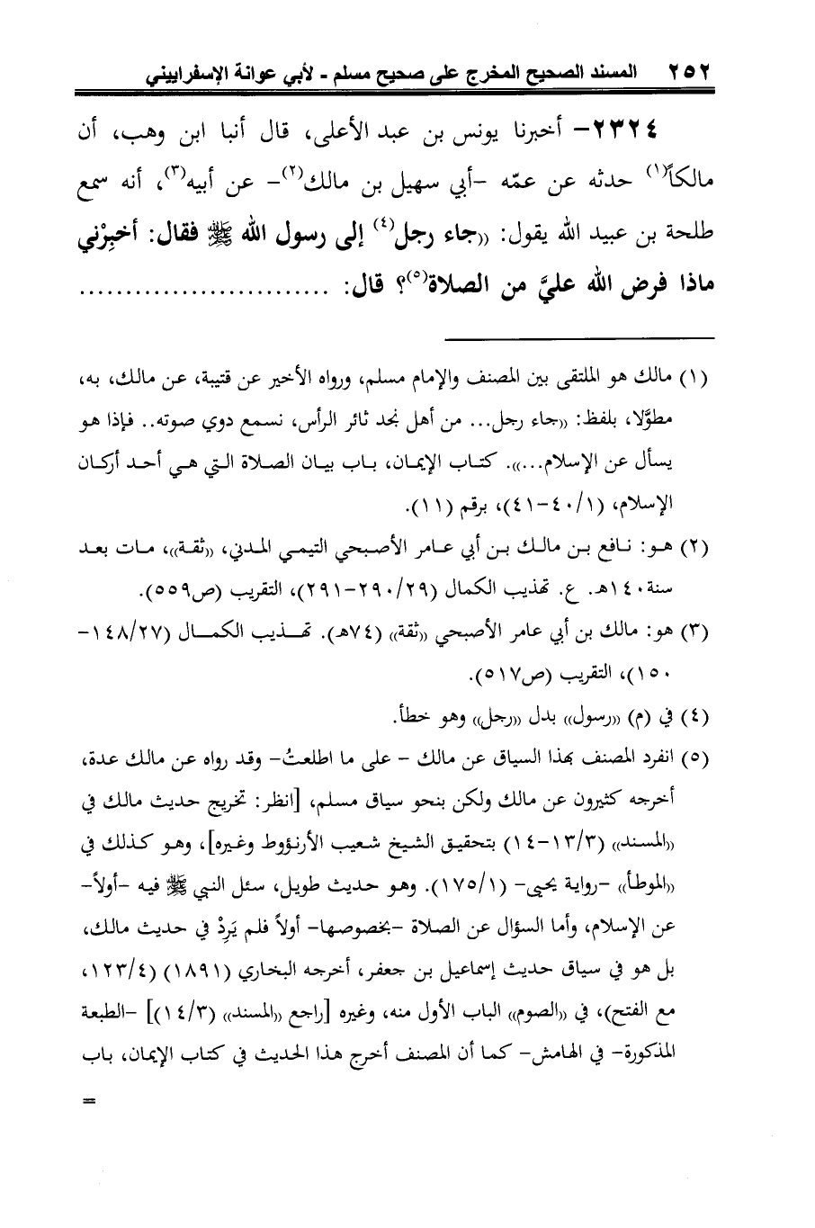 2324 - أخبرنا يونس بن عبد الأعلى، قال أنبأ ابن وهب، أن مالكًا (¬1) حدثه عن عمّه -أبي سهيل بن مالك (¬2) - عن أبيه (¬3)، أنه سمع طلحة بن عبيد الله يقول: "جاء رجل (¬4) إلى رسول الله -صلى الله عليه وسلم- فقال: أخبِرْني ماذا فرض الله عليَّ من الصلاة (¬5)؟ قال: ...