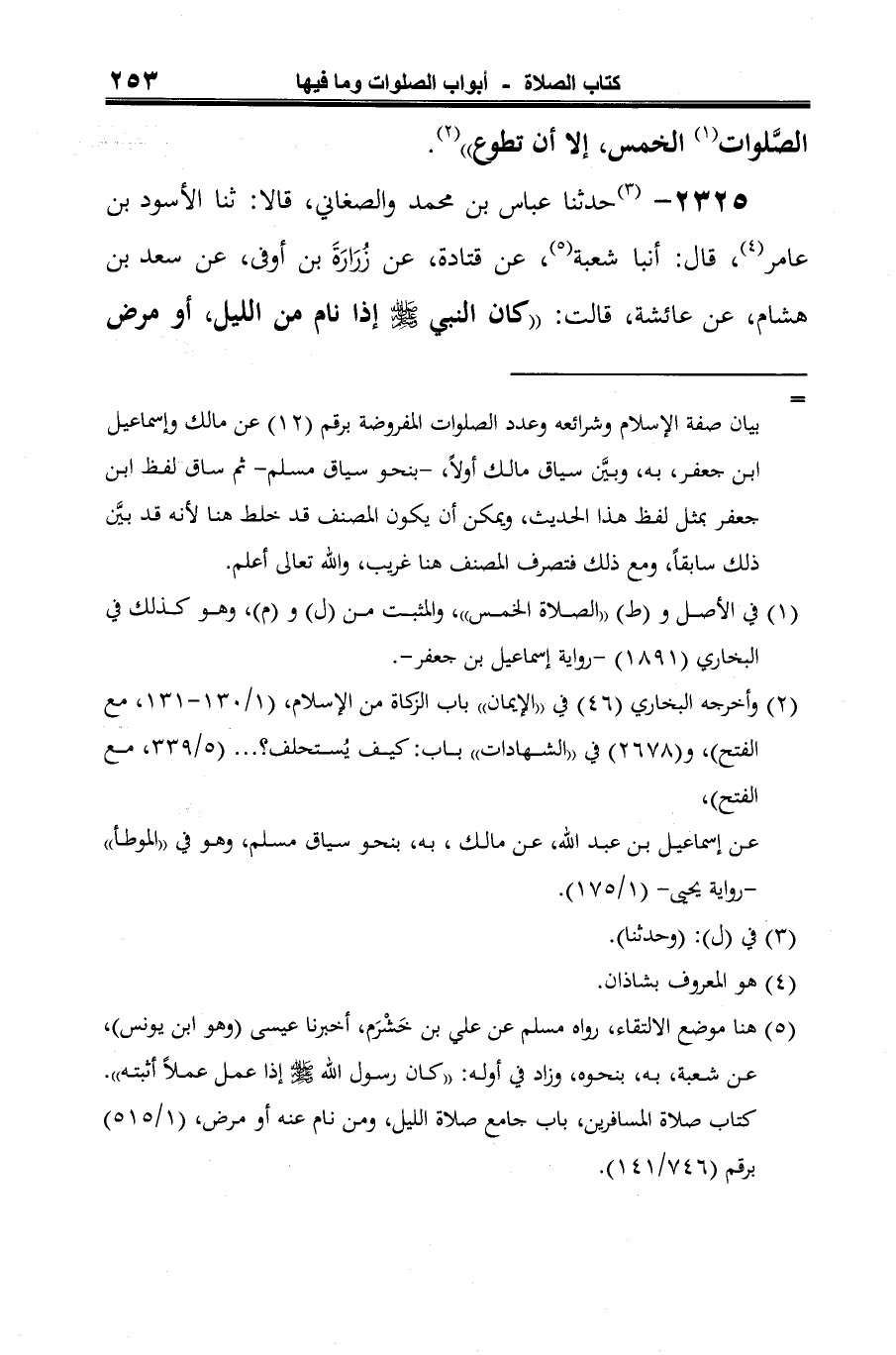 2325 - (¬1) حدثنا عباس بن محمد والصغاني، قالا: ثنا الأسود بن عامر (¬2)، قال: أنبا شعبة (¬3)، عن قتادة، عن زُرَارَةَ بن أوفى، عن سعد بن هشام، عن عائشة، قالت: "كان النبي -صَلَّى الله عَلَيْهِ وَسَلَّمَ- إذا نام من الليل، أو مرض