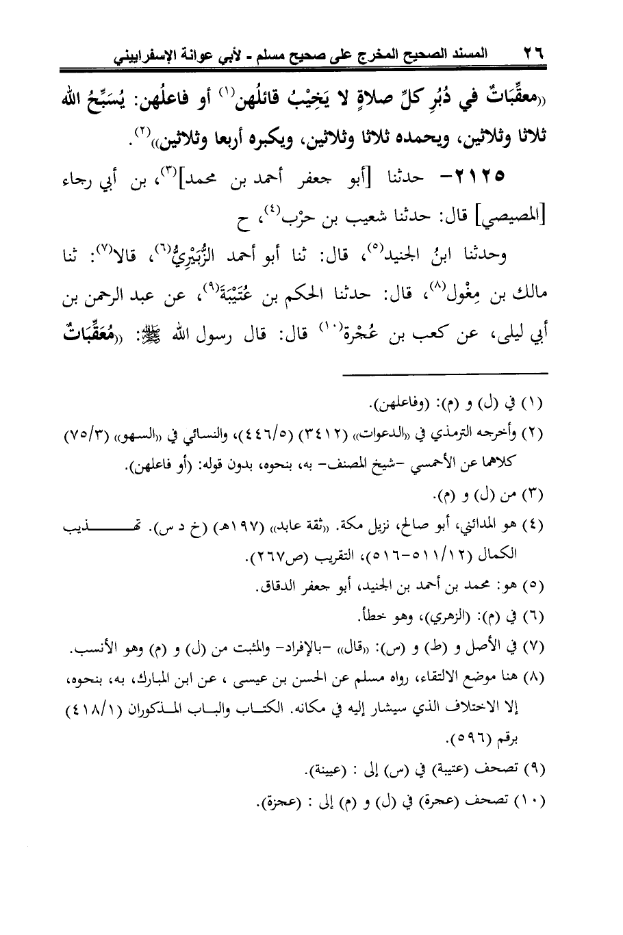 وحدثنا ابنُ الجنيد (¬3)، قال: ثنا أبو أحمد الزُّبَيْرِيُّ (¬4)، قالا (¬5): ثنا مالك بن مِغْول (¬6)، قال: حدثنا الحكم بن عُتَيْبَةَ (¬7)، عن عبد الرحمن بن أبي ليلى، عن كعب بن عُجْرة (¬8) قال: قال رسول الله -صلى الله عليه وسلم-: "مُعَقِّبَاتٌ