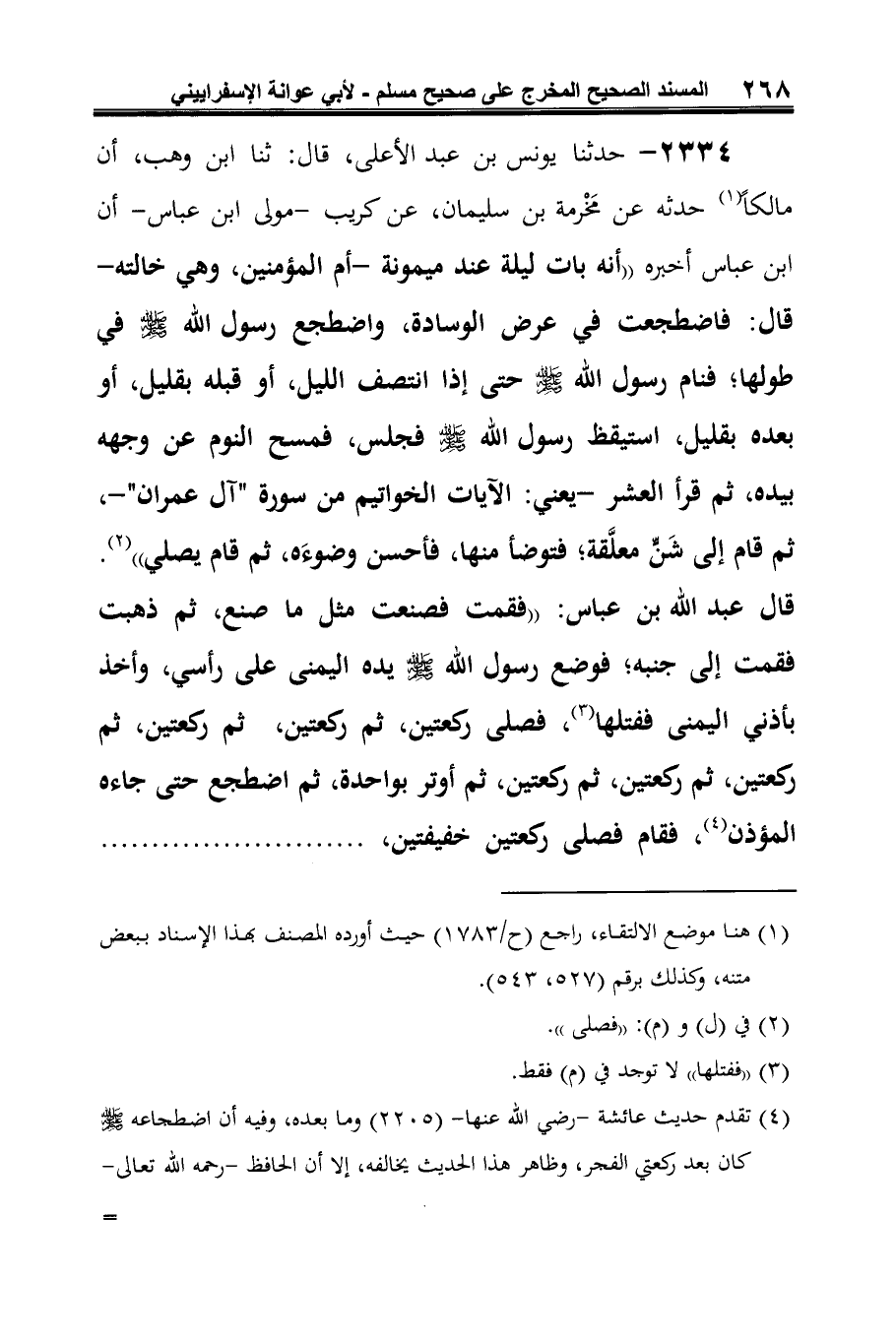 2334 - حدثنا يونس بن عبد الأعلى، قال: ثنا ابن وهب، أن مالكًا (¬1) حدثه عن مَخْرمة بن سليمان، عن كريب -مولى ابن عباس- أن ابن عباس أخبره "أنه بات ليلة عند ميمونة -أم المؤمنين، وهي خالته- قال: فاضطجعت في عرض الوسادة، واضطجع رسول الله -صَلَّى الله عَلَيْهِ وَسَلَّمَ- في طولها، فنام رسول الله -صلى الله عليه وسلم- حتى إذا انتصف الليل، أو قبله بقليل، أو بعده بقليل، استيقظ رسول الله -صلى الله عليه وسلم- فجلس، فمسح النوم عن وجهه بيده، ثم قرأ العشر -يعني: الآيات الخواتيم من سورة "آل عمران"-، ثم قام إلى شَنٍّ معلَّقة، فتوضأ منها، فأحسن وضوءَه، ثم قام يصلي" (¬2).