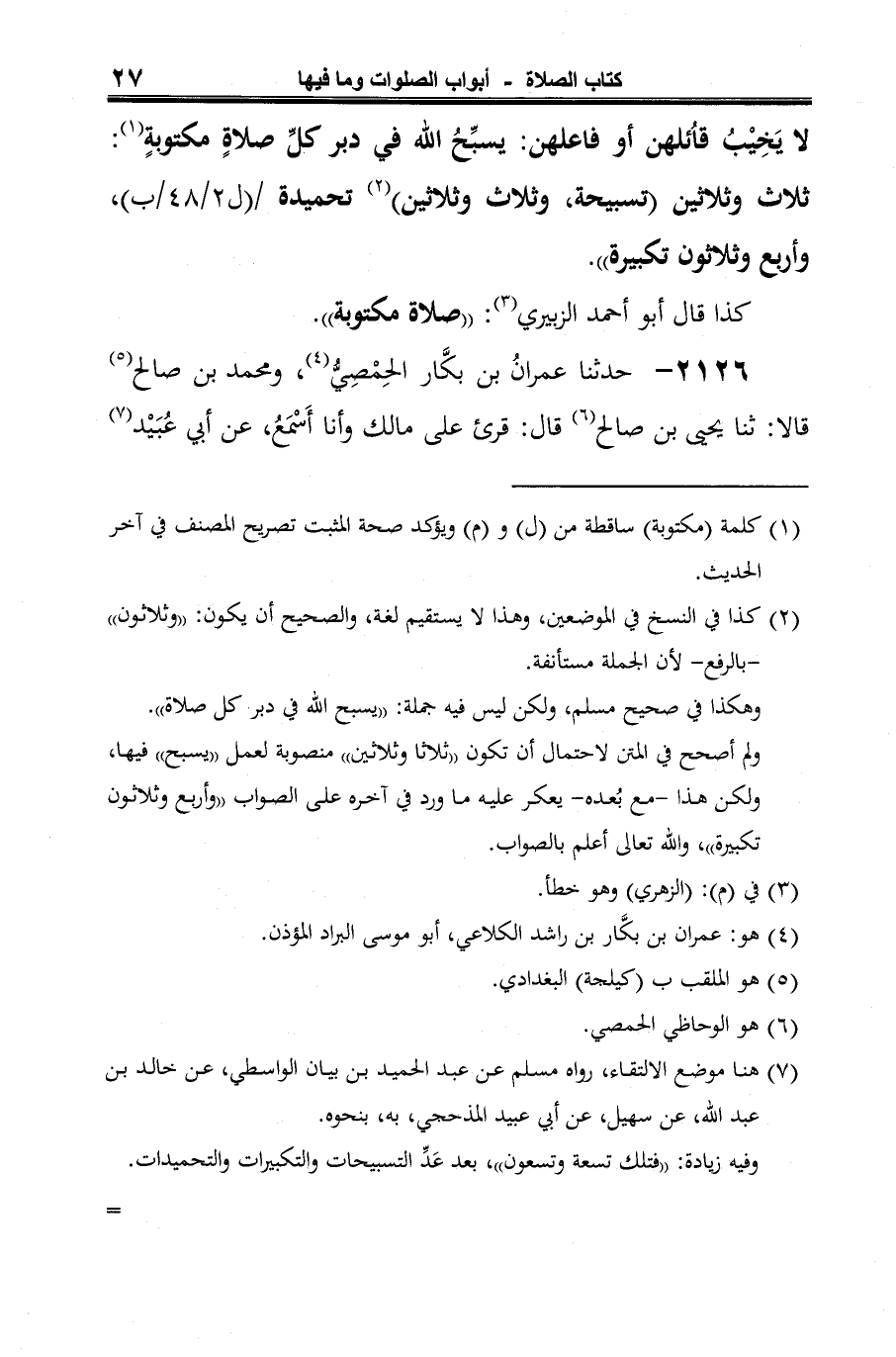 (¬7) في جميع النسخ: (ثلاث) -بالرفع في المواضع الثلاثة- وهو خطأ، لأنه مفعول به لـ (سَبَّح) -وكذلك كبر وحمد- والتصحيح من صحيح مسلم، ويؤكد ذلك قول المصنف في الحديث الآتي (2127) -بعد سرد إسناده-: "بمثله".