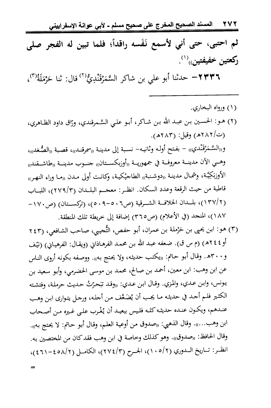 2336 - حدثنا أبو علي بن شكر السَّمَرْقَنْدِيُّ (¬1) قال: ثنا حَرْمَلَةُ (¬2)،