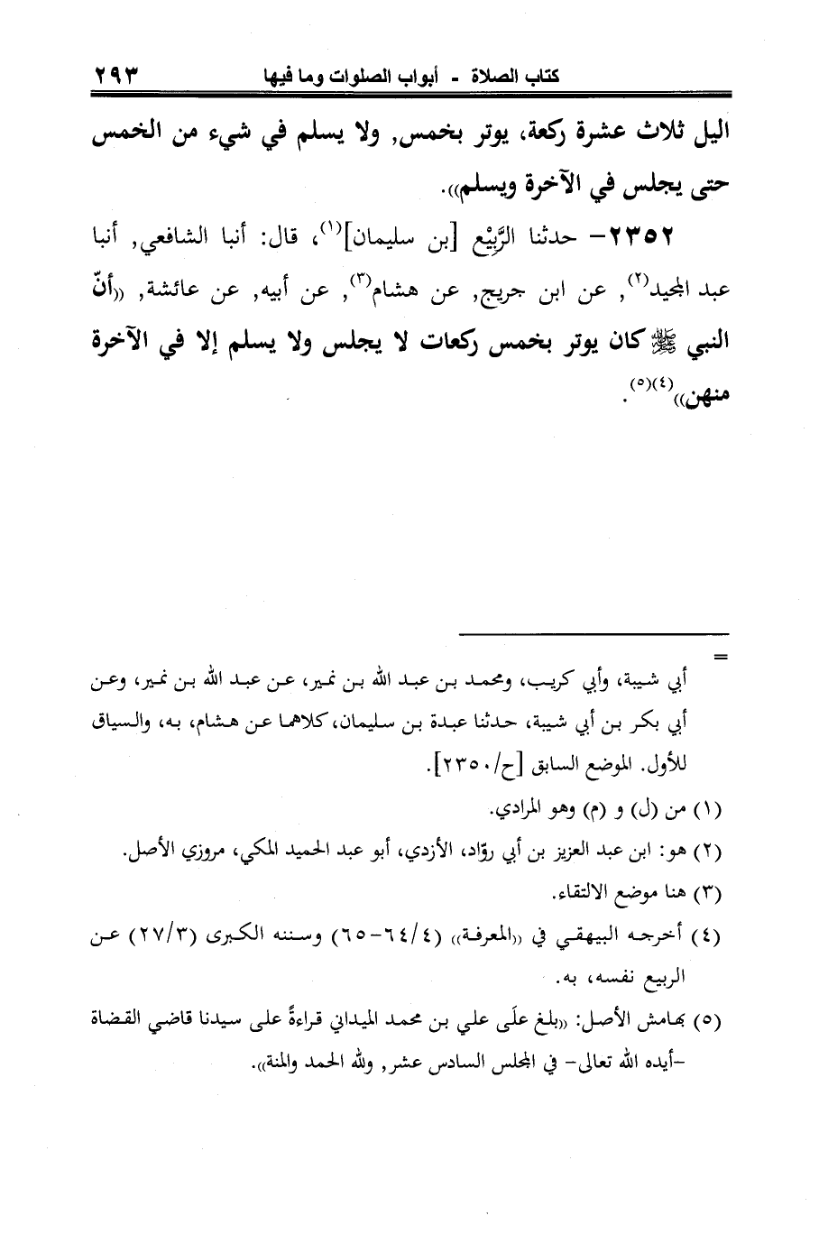2352 - حدثنا الرَّبِيْع [بن سليمان] (¬1)، قال: أنبا الشافعي، أنبا عبد المجيد (¬2)، عن ابن جريج، عن هشام (¬3)، عن أبيه، عن عائشة، "أنّ النبي -صلى الله عليه وسلم- كان يوتر بخمس ركعات لا يجلس ولا يسلم إلا في الآخرة منهن" (¬4) (¬5).