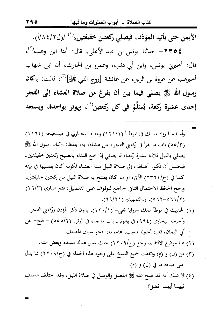 2354 - حدثنا يونس بن عبد الأعلى، قال: أبنا ابن وهب (¬1)، قال: أخبرني يونس، وابن أبي ذئب، وعمرو بن الحارث، أن ابن شهاب أخبرهم، عن عروة بن الزبير، عن عائشة [زوج النبي -صلى الله عليه وسلم-] (¬2)، قالت: "كان رسول الله -صلى الله عليه وسلم- يصلي فيما بين أن يفرغ من صلاة العشاء إلى الفجر إحدى عشرة ركعة، يُسَلِّمُ في كل ركعتين (¬3)، ويوتر بواحدة، ويسجد