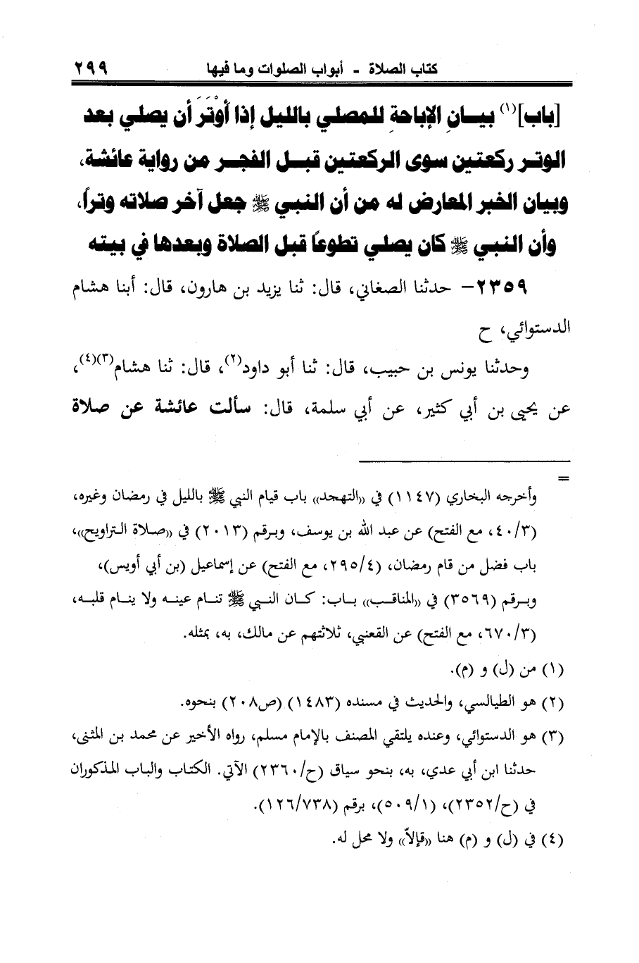 2359 - حدثنا الصغاني، قال: ثنا يزيد بن هارون، قال: أبنا هشام الدستوائي، ح