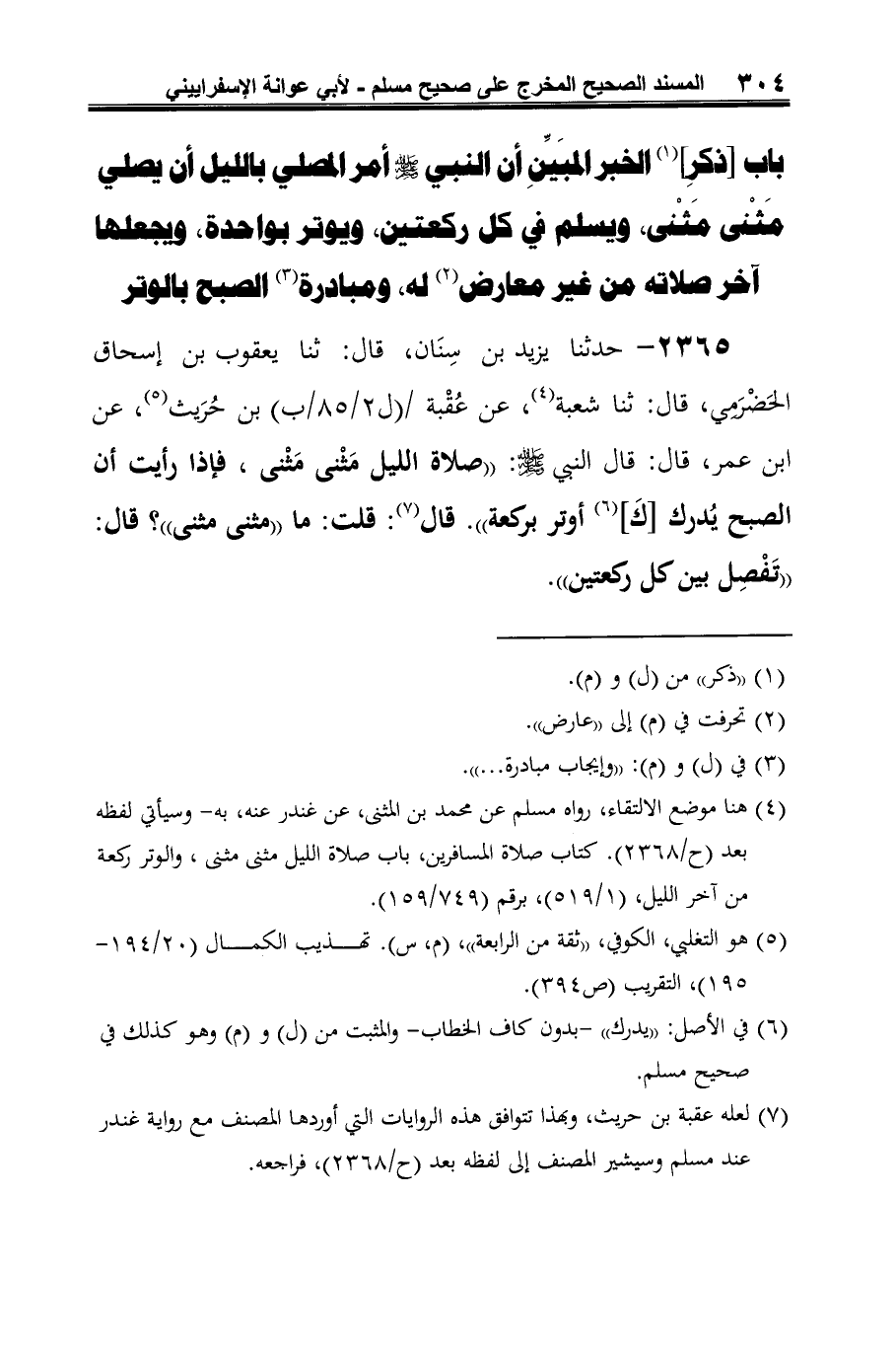 (¬4) لعلّه عقبة بن حريث، وهذا تتوافق هذه الروايات التي أوردها المصنِّف مع رواية غندر عند مسلم وسيشير المصنِّف إلى لفظه بعد (ح / 2368)، فراجعه.