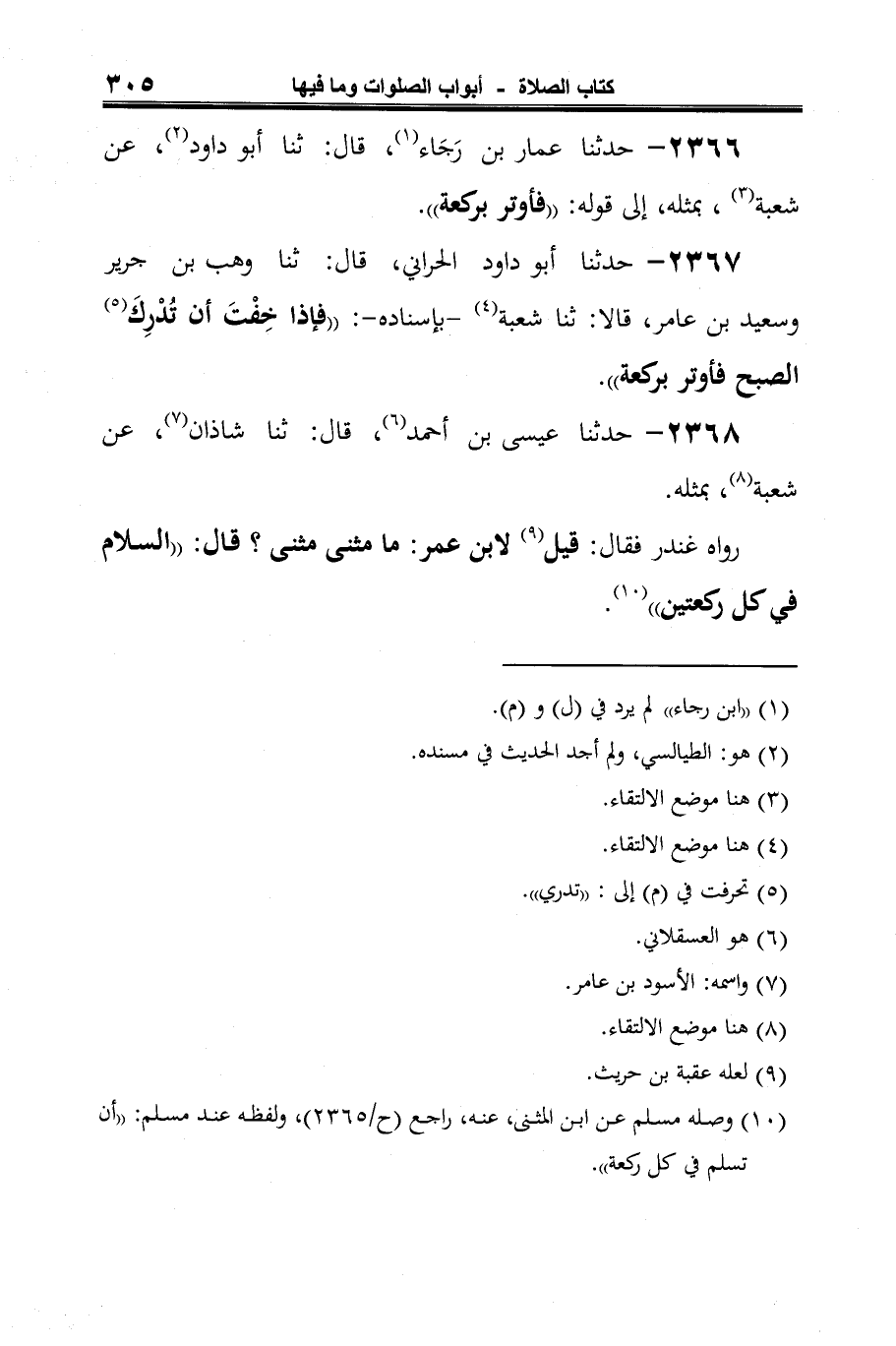 2366 - حدّثنا عمار بن رَجَاء (¬1)، قال: ثنا أبو داود (¬2)، عن شعبة (¬3)، بمثله، إلى قوله: "فأوتر بركعة".