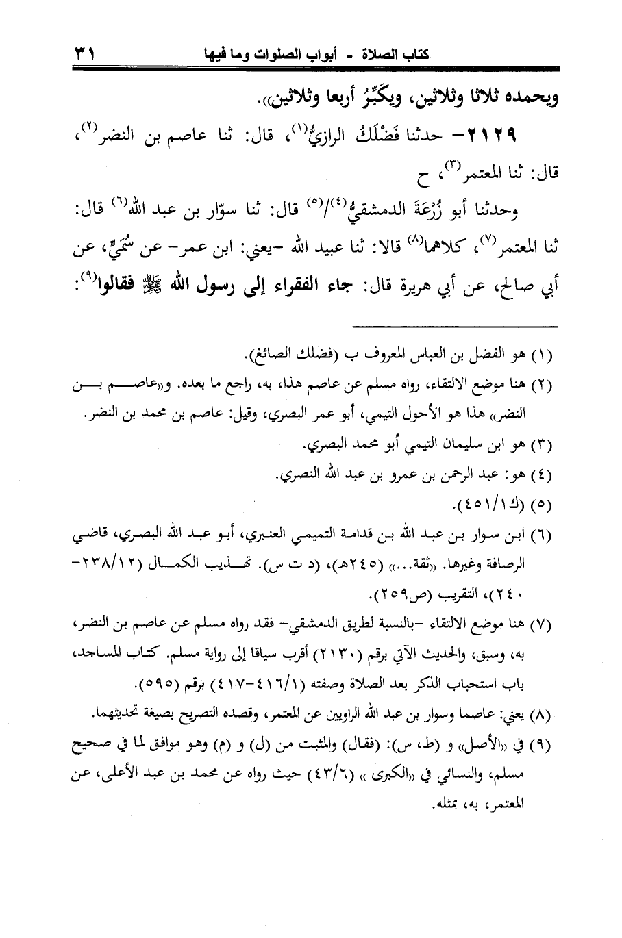 (¬7) هنا موضع الالتقاء -بالنسبة لطريق الدمشقي- فقد رواه مسلم عن عاصم بن النضر، به، وسبق، والحديث الآتي برقم (2130) أقرب سياقًا إلى رواية مسلم. كتاب المساجد، باب استحباب الذكر بعد الصلاة وصفته (1/ 416 - 417) برقم (595).