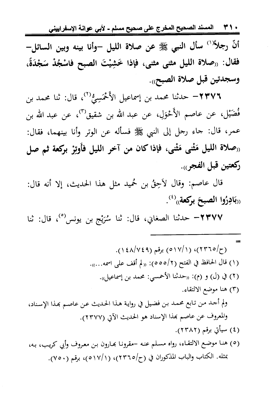 2376 - حدّثنا محمّد بن إسماعيل الأَحْمَسِيُّ (¬1)، قال: ثنا محمّد بن فُضَيْل، عن عاصم الأَحْوَلِ، عن عبد الله بن شقيق (¬2)، عن عبد الله بن عمر، قال: جاء رجل إلى النبي -صلى الله عليه وسلم- فسأله عن الوتر وأنا بينهما، فقال: "صلاة اللّيل مَثْنى مَثْنى، فإذا كان من آخر اللّيل فَأوتِرْ بركعة ثمّ صل ركعتين قبل الفجر".
