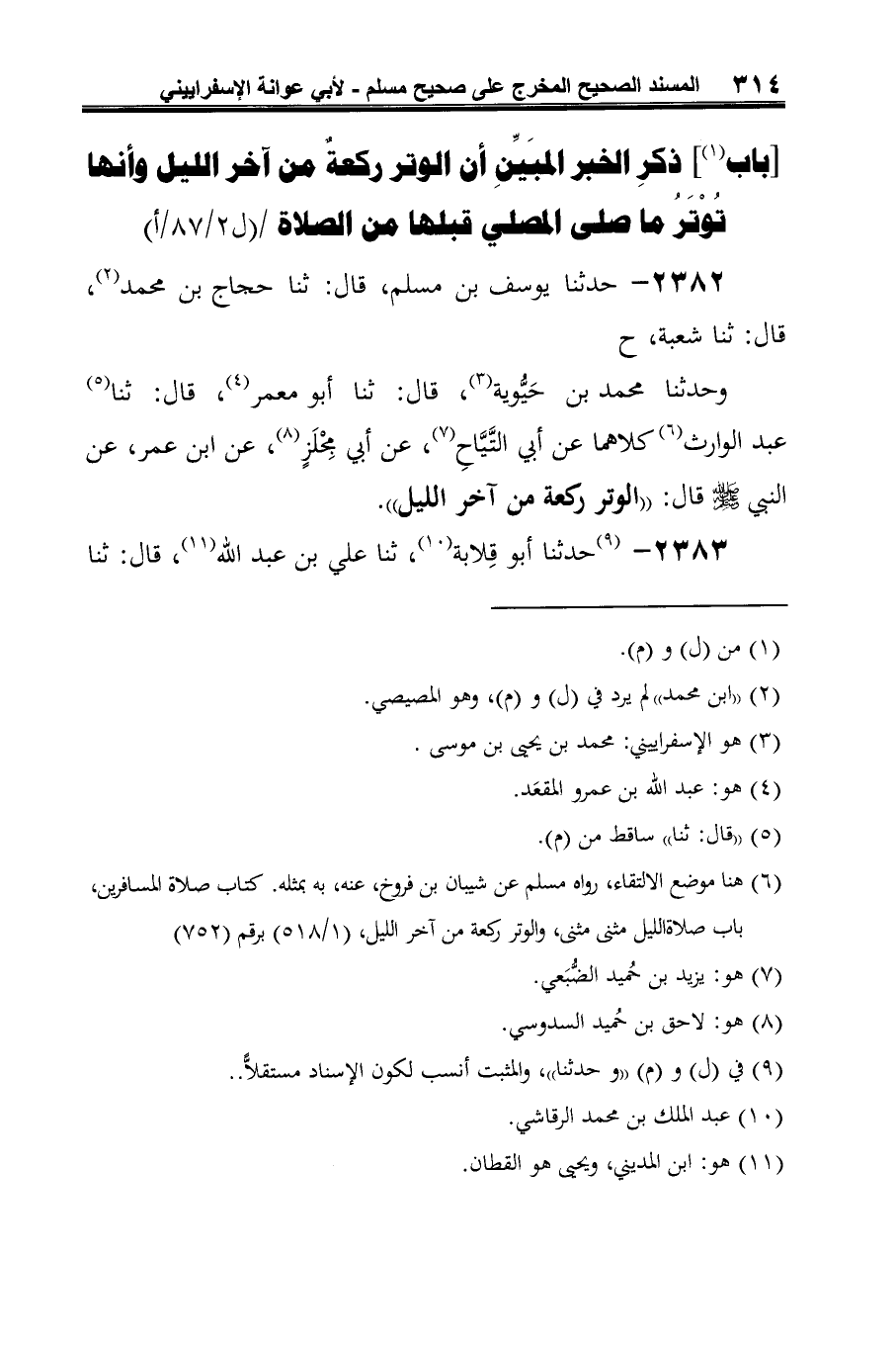 (¬5) هنا موضع الالتقاء، رواه مسلم عن شيبان بن فروخ، عنه، به بمثله. كتاب صلاة المسافرين، باب صلاة اللّيل مثنى مثنى، والوتر ركعة من آخر اللّيل، (1/ 518) برقم (752).
