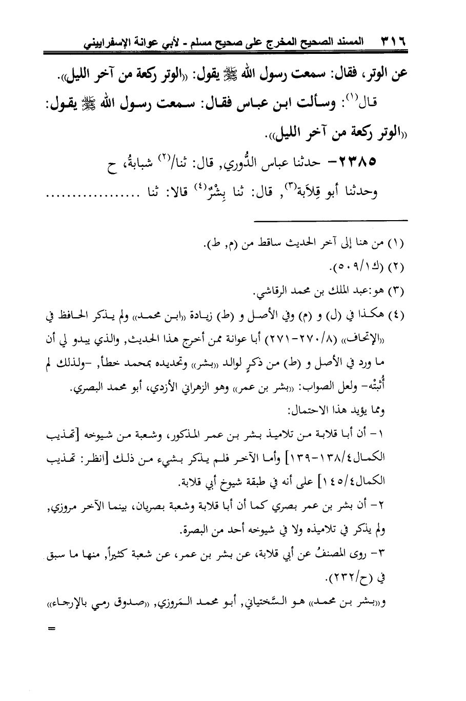 (¬3) هكذا في (ل) و (م) وفي الأصل و (ط) زيادة "ابن محمّد" ولم يذكر الحافظ في "الإتحاف" (8/ 270 - 271) أبا عوانة ممّن أخرج هذا الحديث، والذي يبدو لي أن ما ورد في الأصل و (ط) من ذكرٍ لوالد "بشر" وتحديده بمحمد خطأ، -ولذلك لم أُثبتْه- ولعلّ الصواب: "بشر بن عمر" وهو الزهراني الأزدي، أبو محمّد البصري.