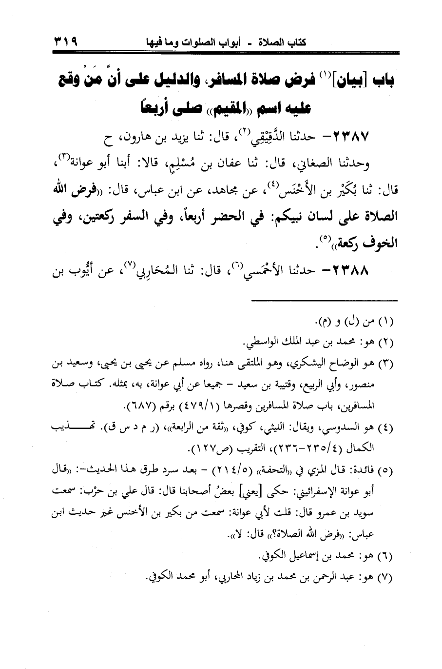 وحدثنا الصغاني، قال: ثنا عفان بن مُسْلِمٍ، قالا: أبنا أبو عوانة (¬2)، قال: ثنا بُكَيْر بن الأَخْنَس (¬3)، عن مجاهد، عن ابن عبّاس، قال: "فرض الله الصّلاة على لسان نبيكم: في الحضر أربعًا، وفي السَّفر ركعتين، وفي الخوف ركعة" (¬4).
