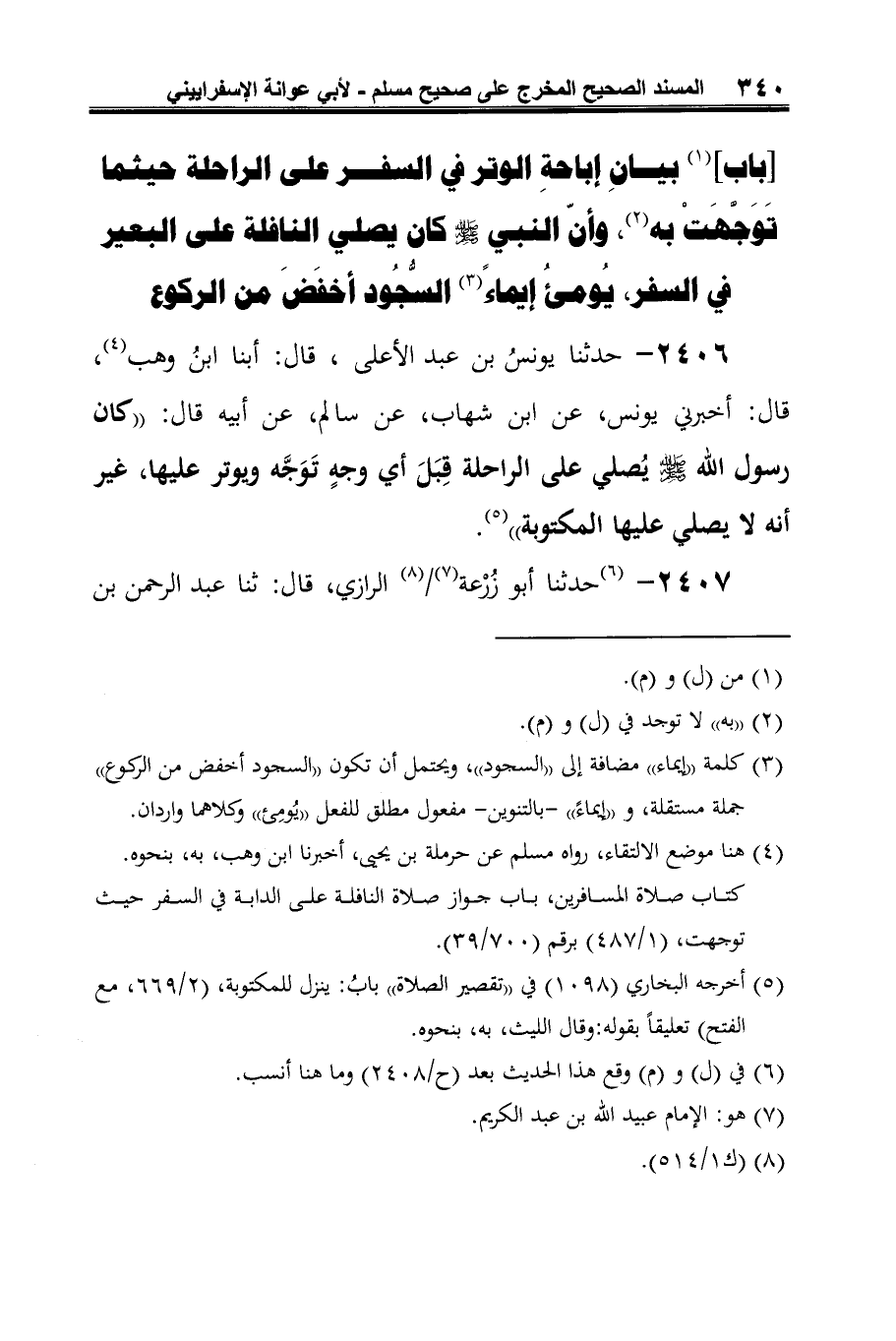 2406 - حدّثنا يونسُ بن عبد الأعلى، قال: أبنا ابنُ وهب (¬1)، قال: أخبرني يونس، عن ابن شهاب، عن سالم، عن أبيه قال: "كان رسول الله -صلى الله عليه وسلم- يُصلّي على الراحلة قِبَلَ أي وجهٍ تَوَجَّه ويوتر عليها، غير أنه لا يصلّى عليها المكتوبة" (¬2).