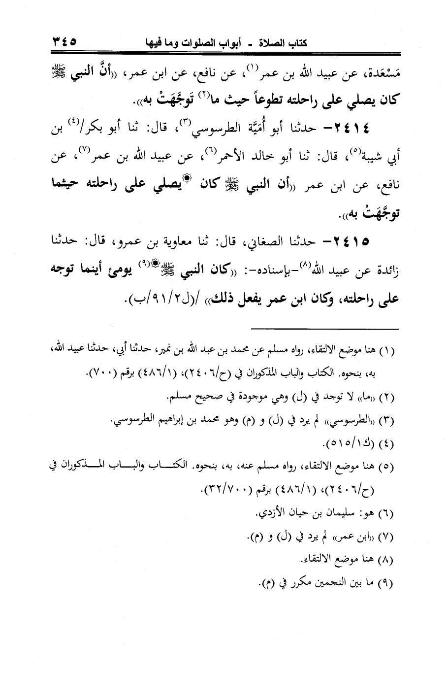 2414 - حدّثنا أبو أُمَيَّة الطرسوسي (¬1)، قال: ثنا أبو بكر (¬2) بن أبي شيبة (¬3)، قال: ثنا أبو خالد الأحمر (¬4)، عن عبيد الله بن عمر (¬5)، عن نافع، عن ابن عمر "أن النّبيّ -صلى الله عليه وسلم- كان * يصلّي على راحلته حيثما توجَّهَتْ به".