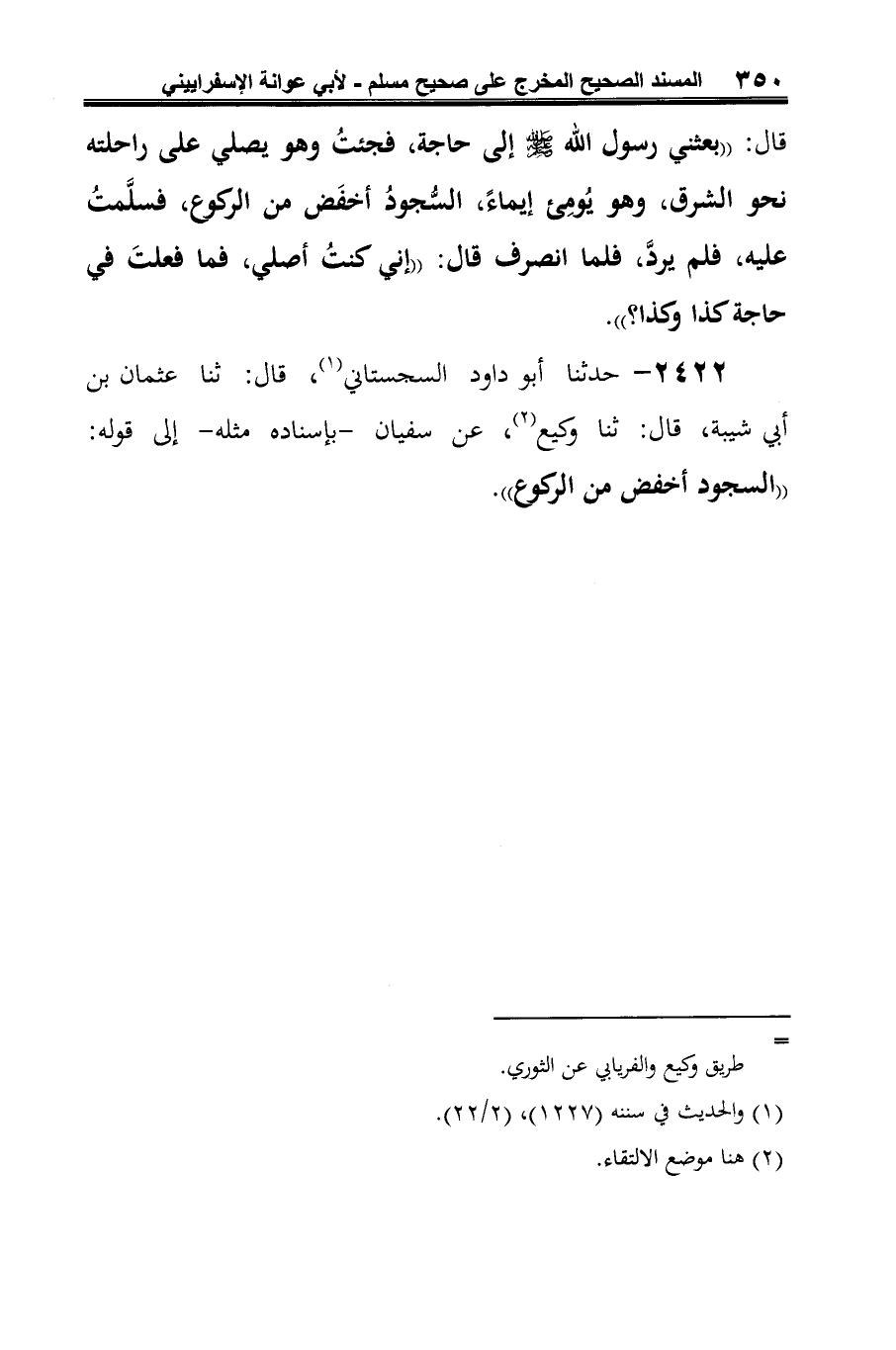 2422 - حدّثنا أبو داود السجستاني (¬1)، قال: ثنا عثمان بن أبي شيبة، قال: ثنا وكيع (¬2)، عن سفيان -بإسناده مثله- إلى قوله: "السجود أخفض من الركوع".