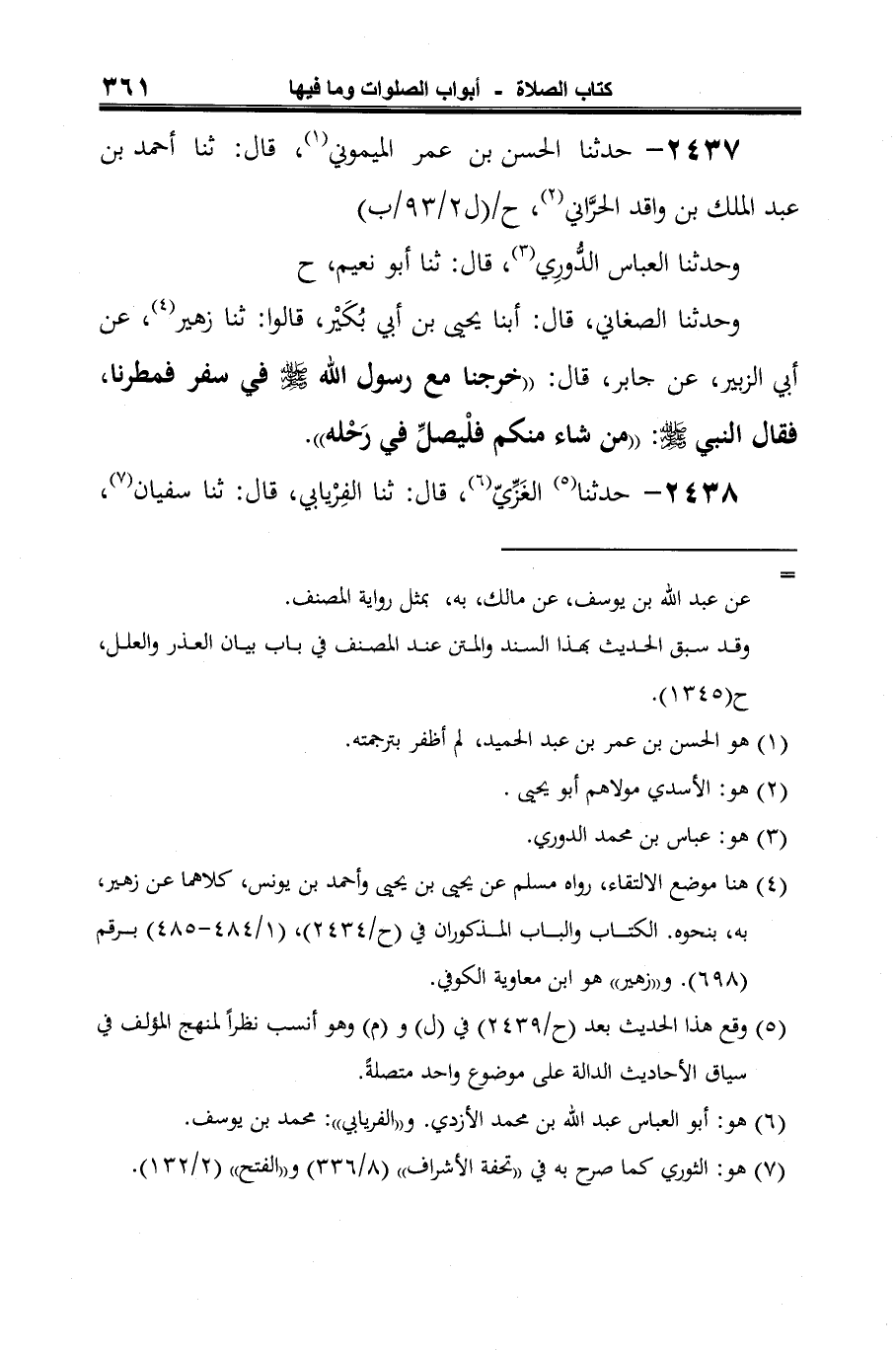 وحدثنا الصغاني، قال: أبنا يحيى بن أبي بُكَيْر، قالوا: ثنا زهير (¬4)، عن أبي الزبير، عن جابر، قال: "خرجنا مع رسول الله -صلى الله عليه وسلم- في سفر فمطرنا، فقال النّبيّ -صلى الله عليه وسلم-: "من شاء منكم فلْيصلِّ في رَحْله".